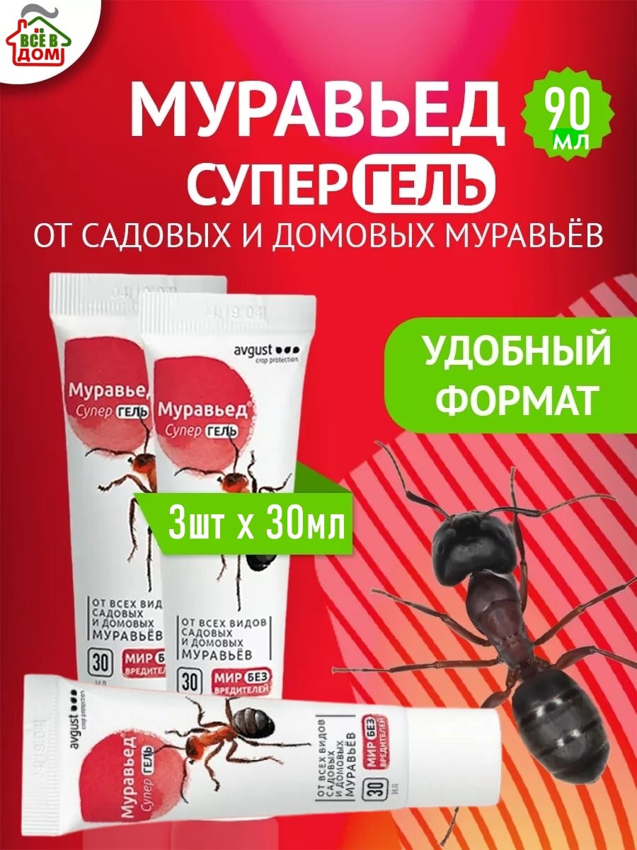 10 цен на Муравьед Супер Гель эффективное средство от садовых и домашних муравьев, туба 3 шт по 30 мл, Август