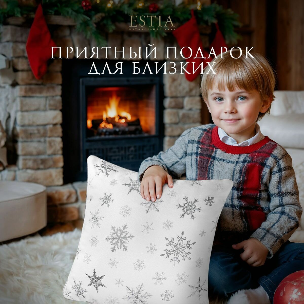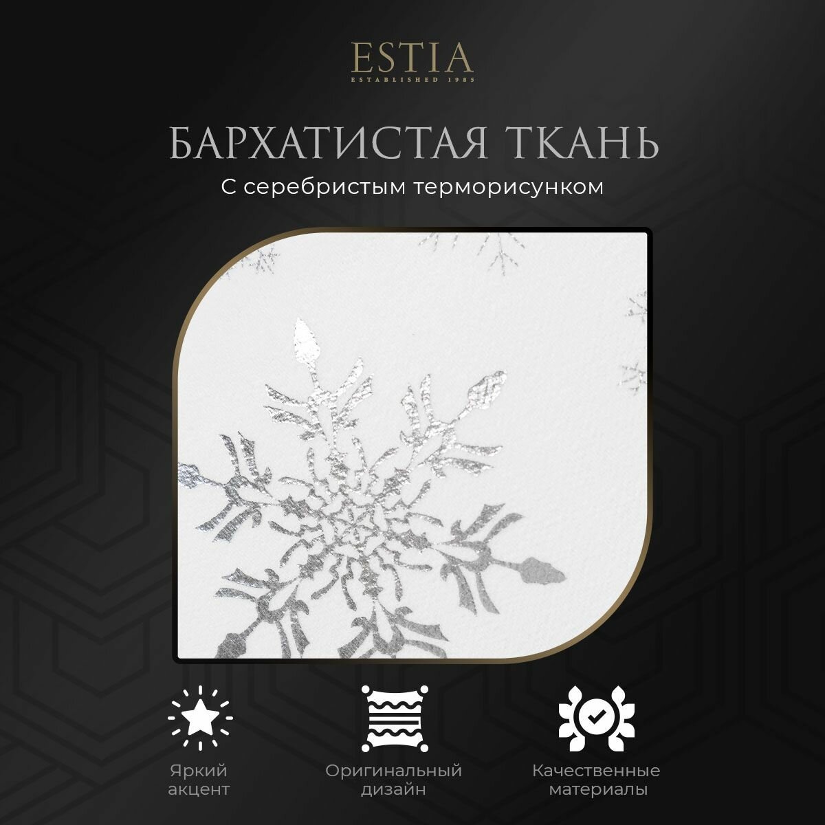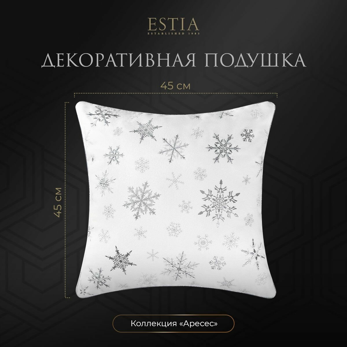 ESTIA Подушка декоративная в подарок "Аресес" в бархатном чехле на молнии "Серебристые снежинки", 45x45 информация: