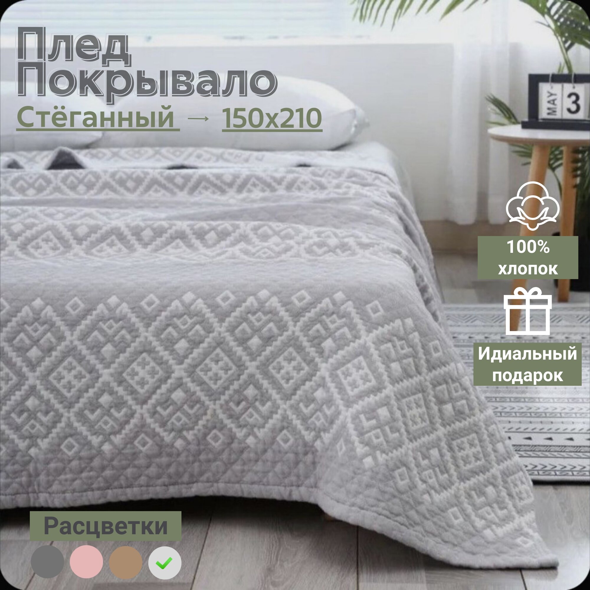 Отзывы на Плед-Покрывало "Эко Хлопок" 150 x 210, Геометрический Рисунок, Светло-Серый