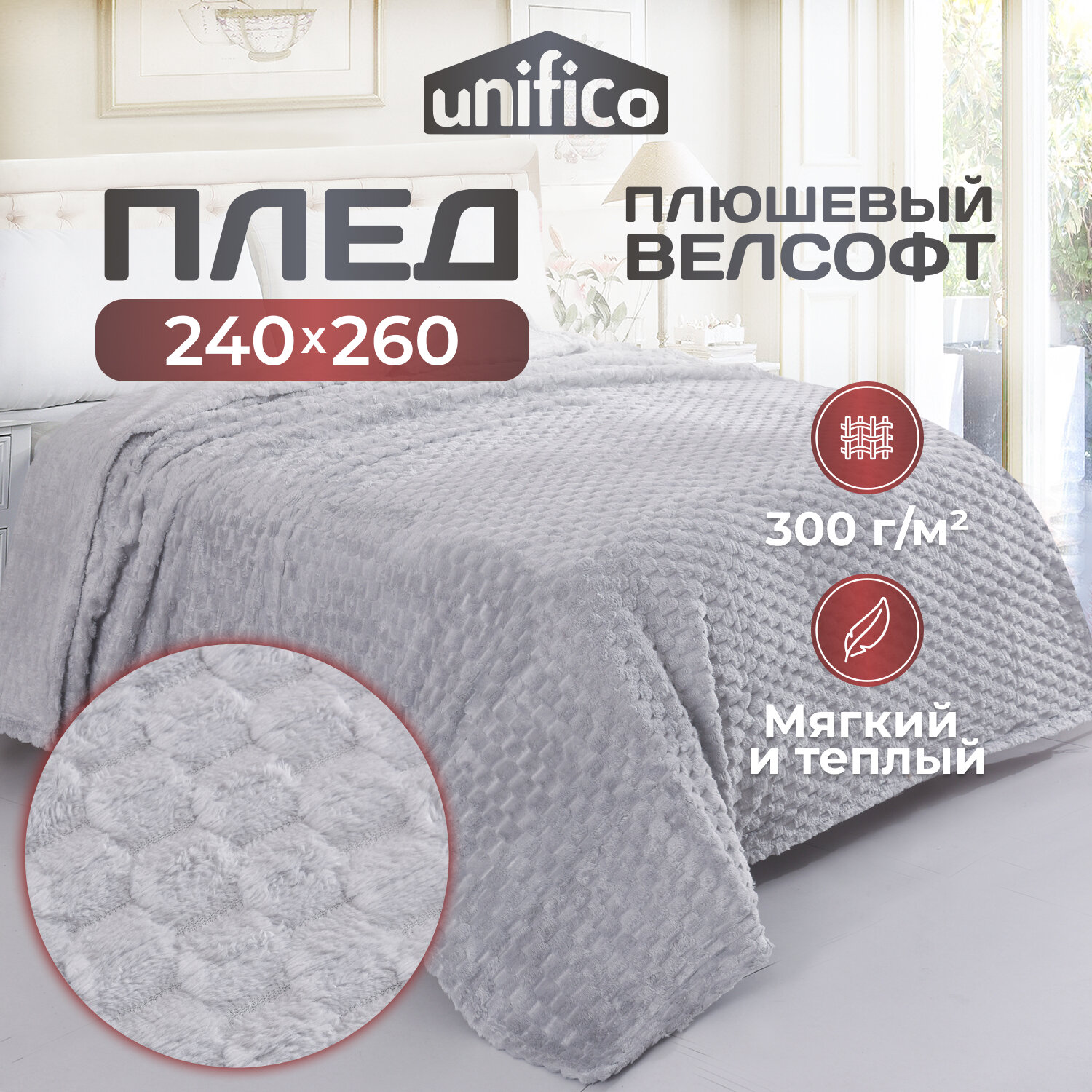 Отзывы на Плед Unifico "Elba Grey", велсофт, 100 % полиэстер, плотность 300г/м², 240x260 см