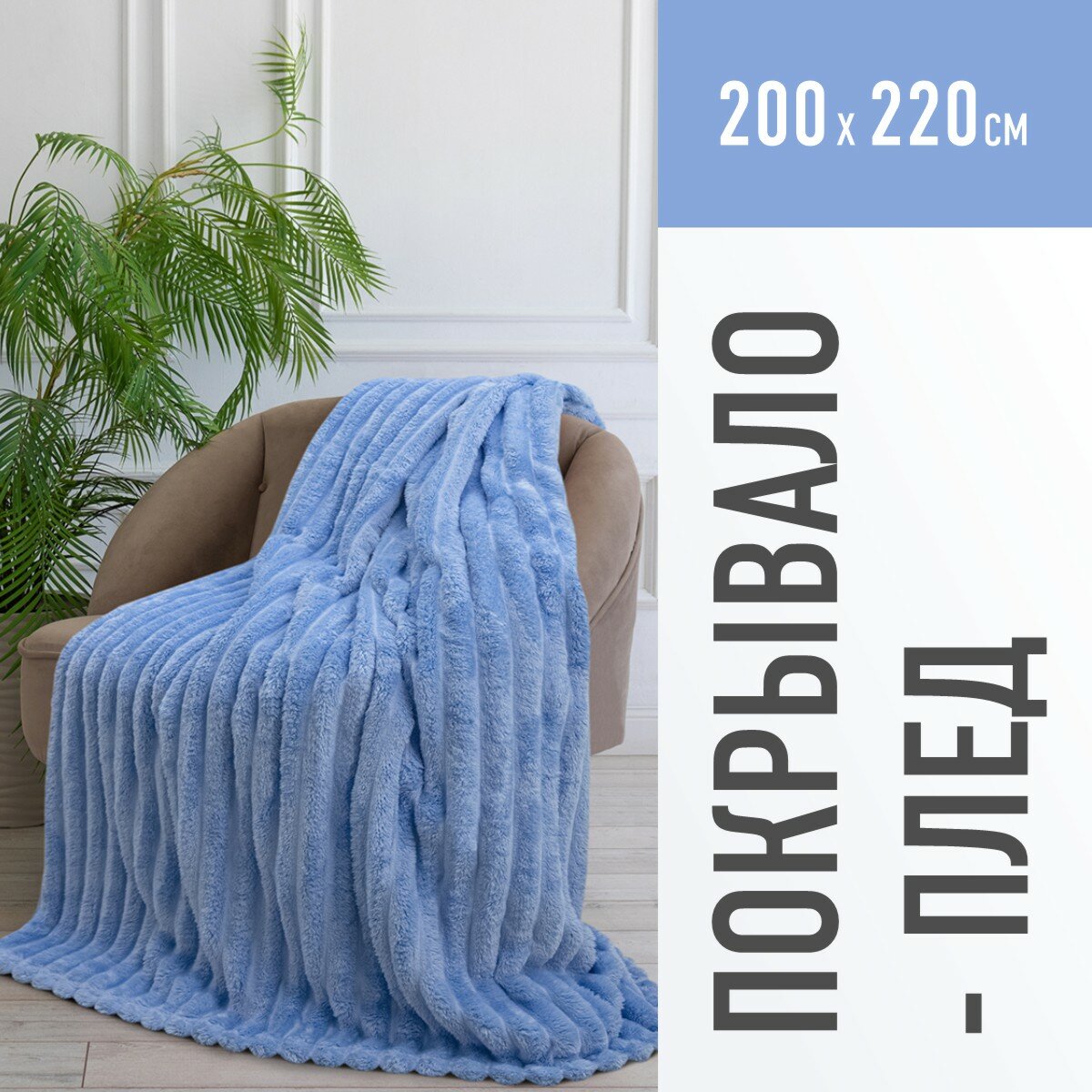 Плед евро 200х220 см, покрывало Happy Family велсофт Волна голубой/мягкий, теплый плед на кровать/кресло/подарок/ для дома/дачи/пикника / NEW 2024/ информация:
