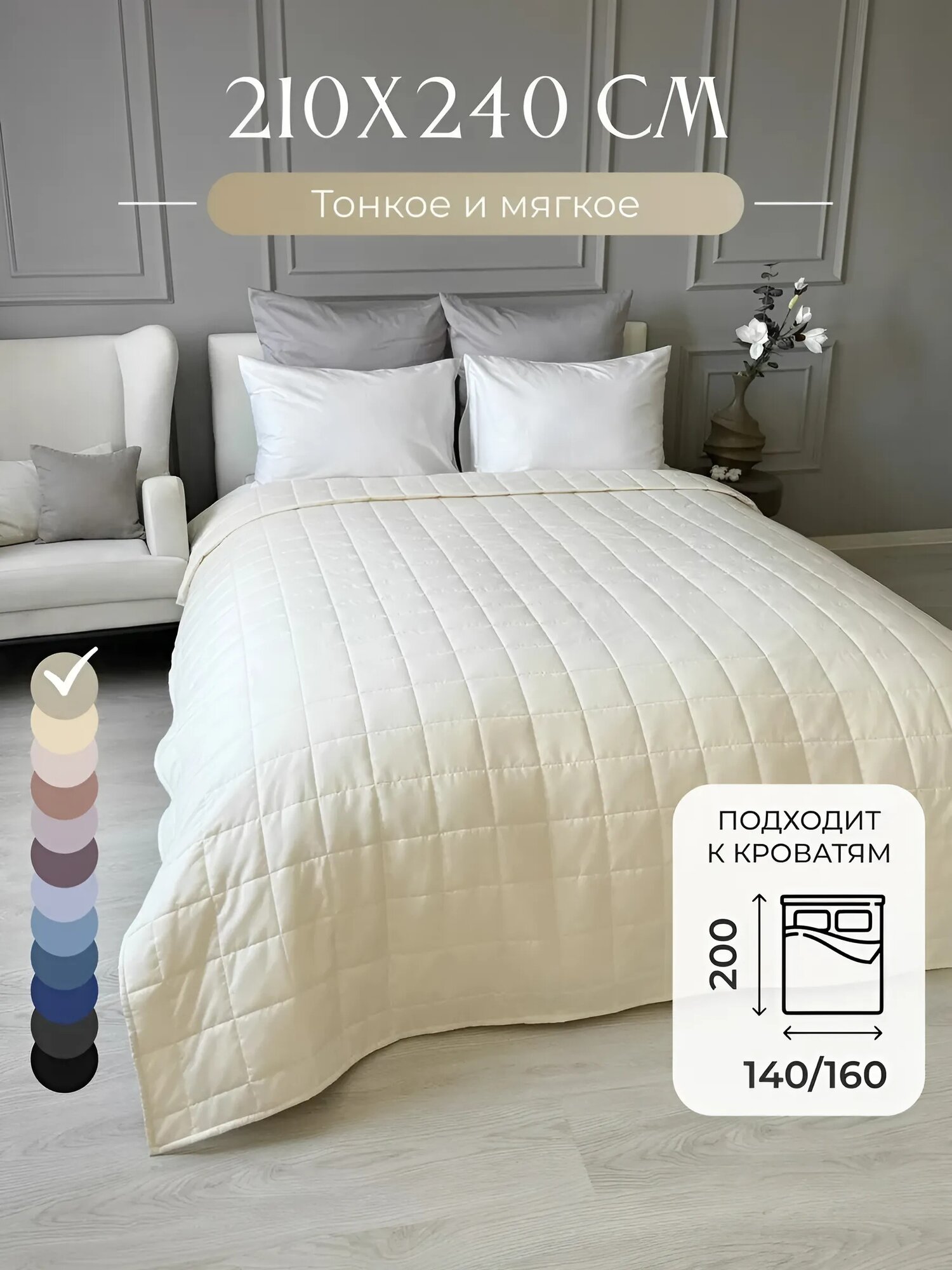 Отзывы на Покрывало на кровать и диван 210х240 см стеганое, слоновая кость, Ушки Подушки