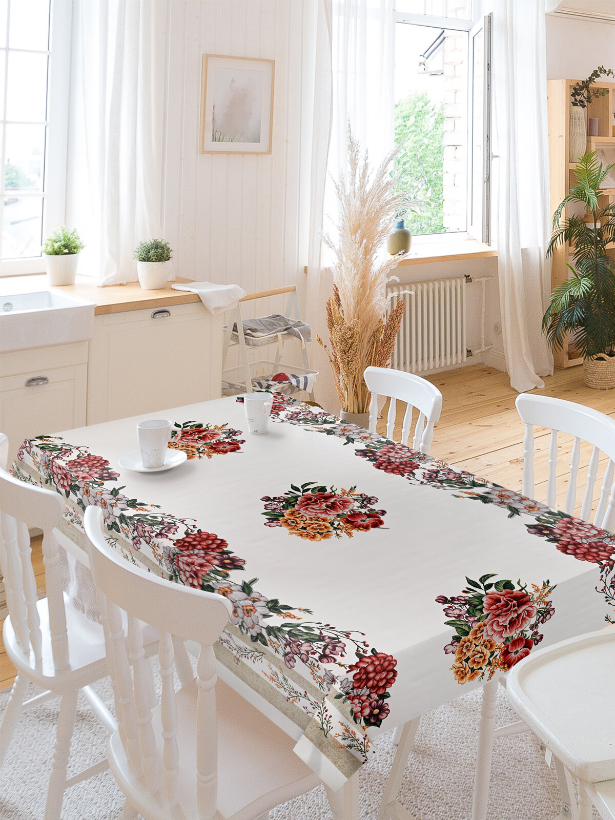 Скатерть на кухонный стол "Сухой букет", круглая на резинке, диаметр 105-120 см, JoyArty