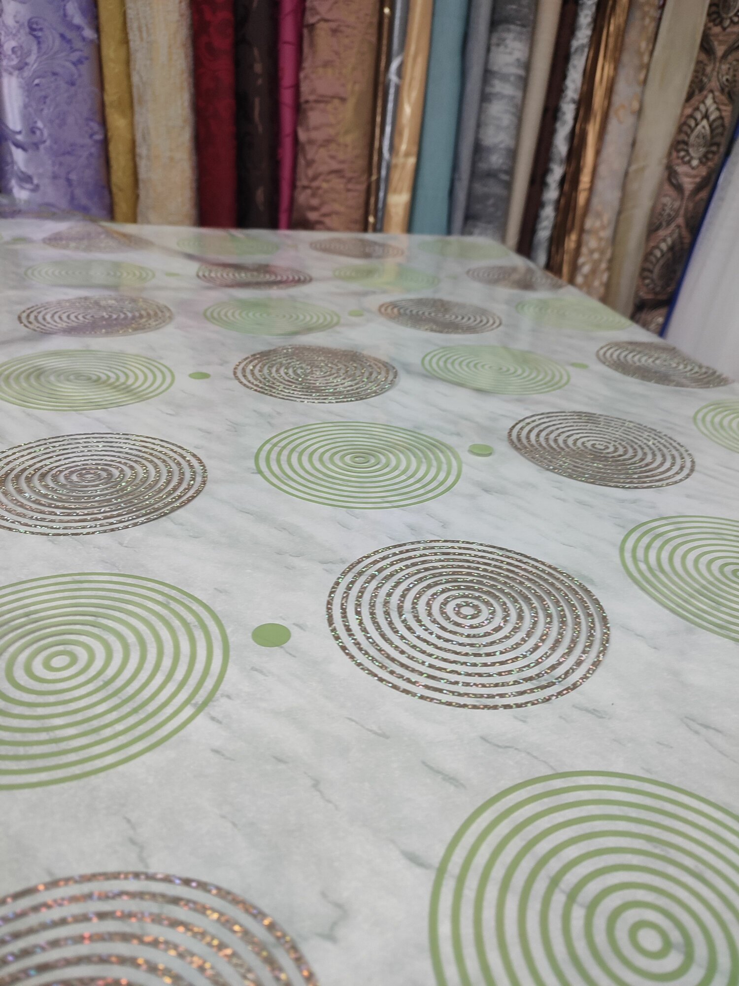 Отзывы на Силиконовая скатерть на стол 80х220 гибкое стекло золотистые зеленые круги
