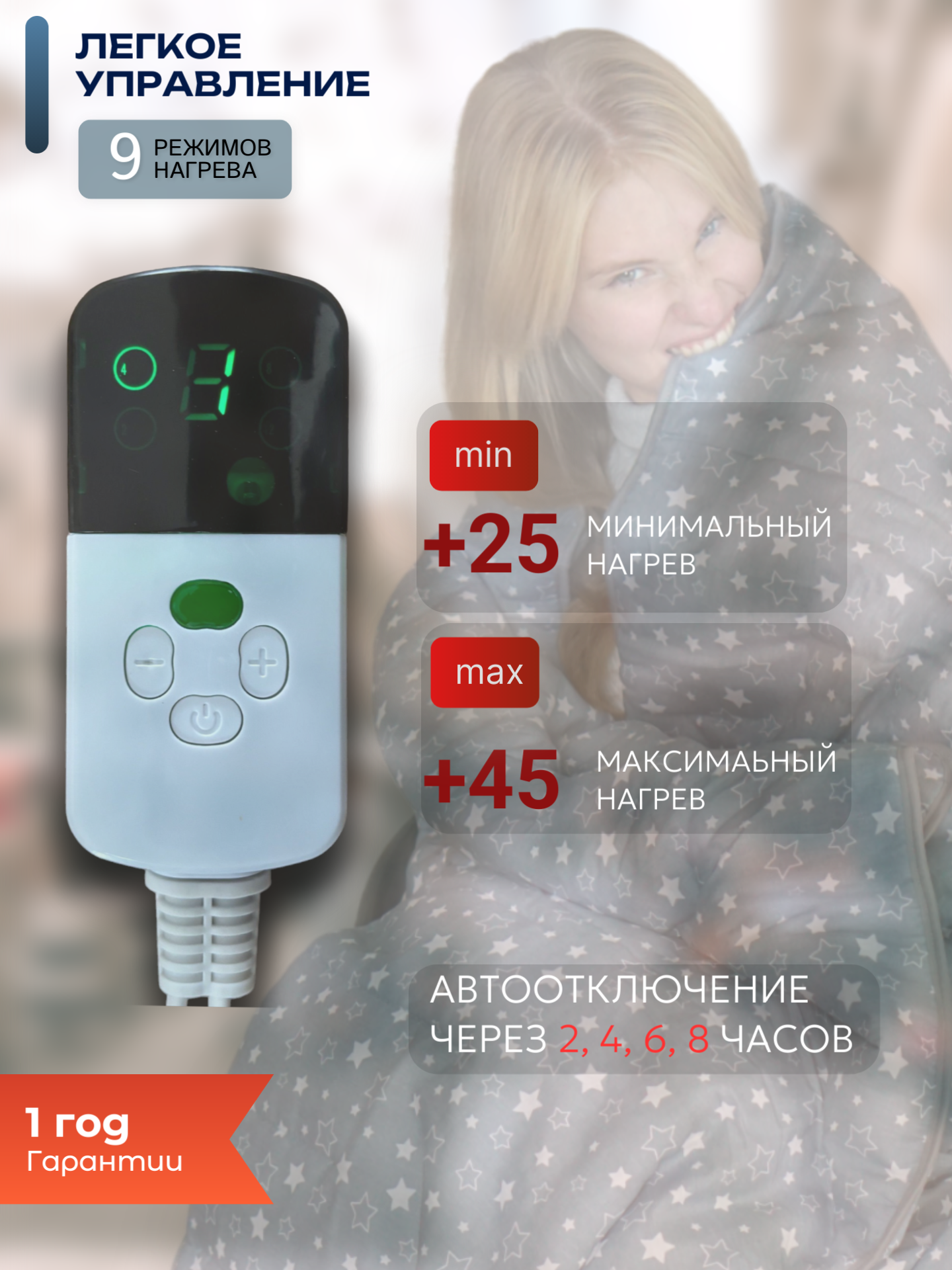 Одеяло с подогревом , электропростынь 150х180 см, электроодеяло, 9 режимов нагрева, 2 зоны оборева.