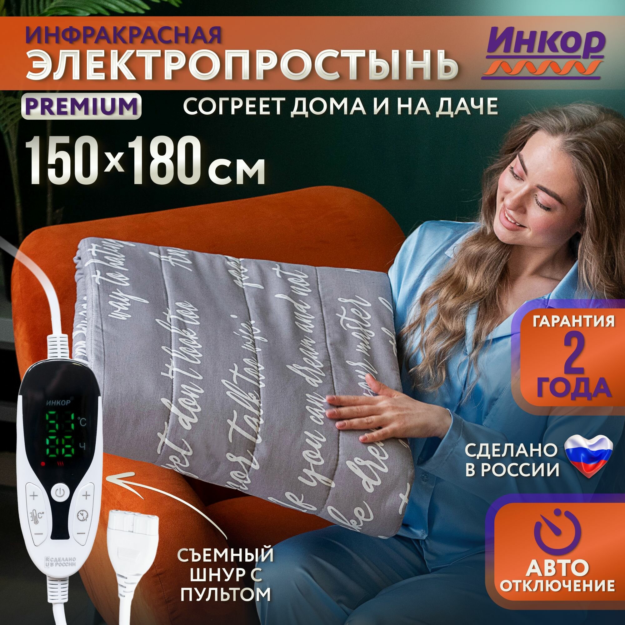 Электропростынь двуспальная инкор Премиум, электропростынь с подогревом инфракрасная, 150х180 см информация: