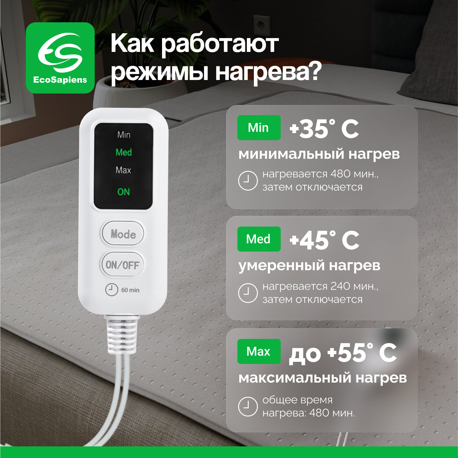 Электропростынь двуспальная EcoSapiens Marsel 150х180 см, 3 программы, автоотключение через 8 часов информация: