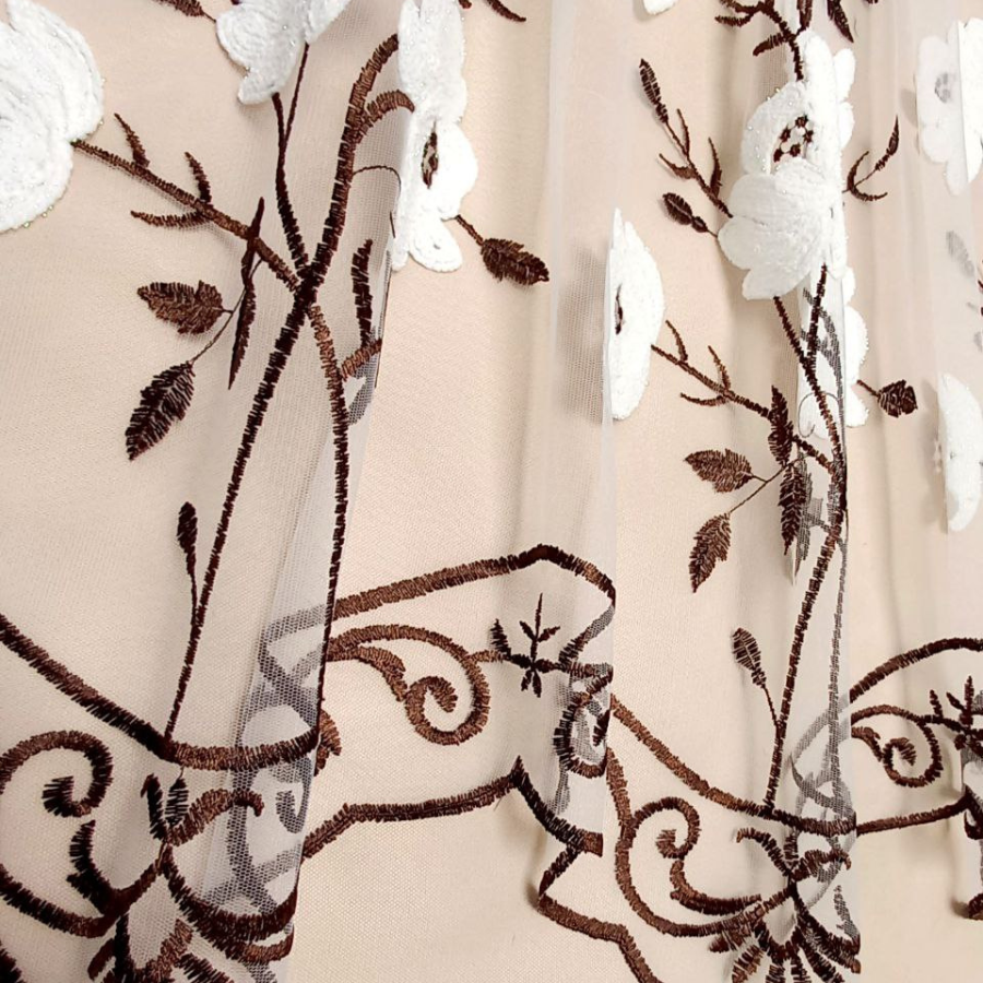 Тюль короткий для кухни 200х150 панно вышивка цветы коричневые в гостиную и детскую информация: