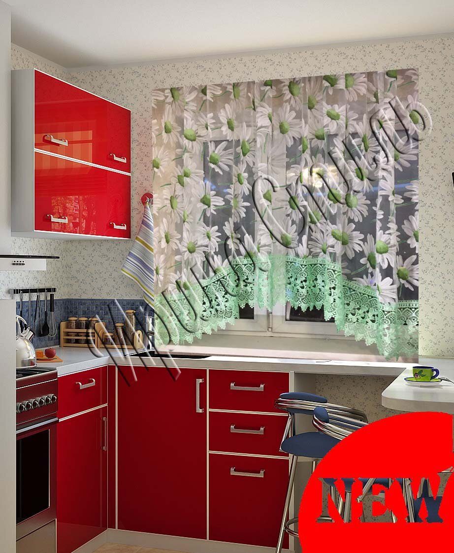 Тюль, шторы для кухни, арка короткая, цветы Ромашка 290*160, гардина, занавески в комнату. информация: