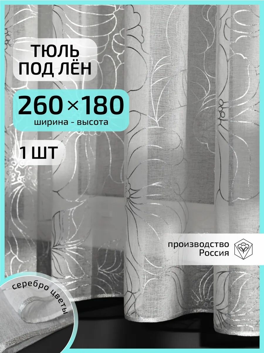 Тюль под лен 260 см ширина 160 см высота серебро-цветы короткий 1 696 ₽