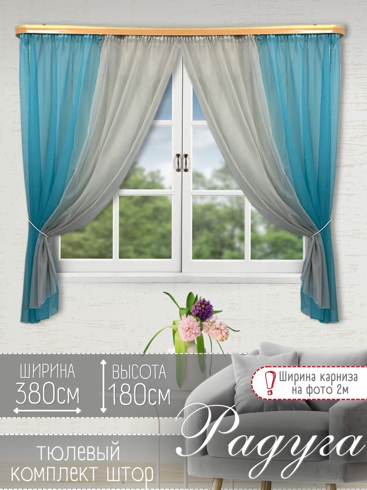 Шторы для кухни короткие тюль вуаль Домтекс35 "Радуга" 380*180см бирюзовый/серый информация: