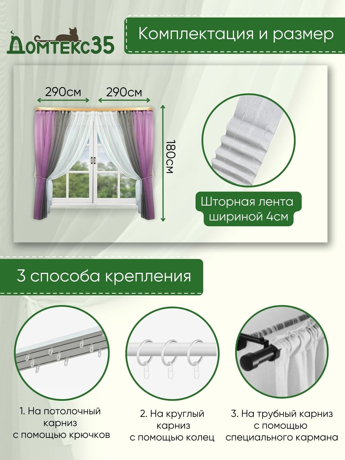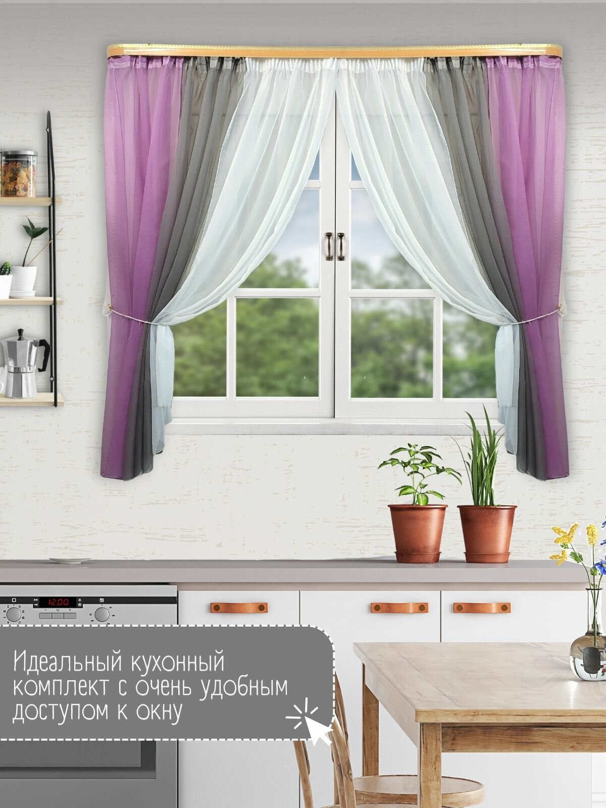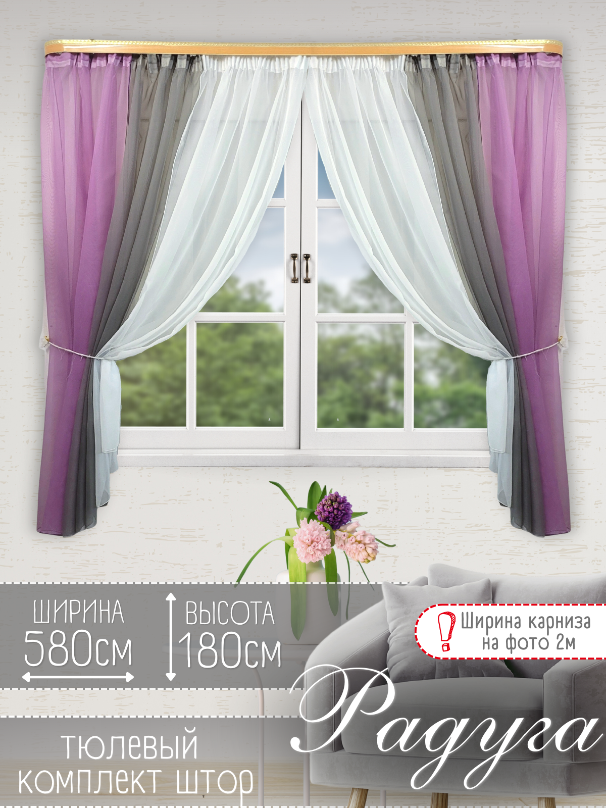 Отзывы на Шторы для кухни короткие тюль вуаль Домтекс35 "Радуга" 580*180см сиреневый/серый