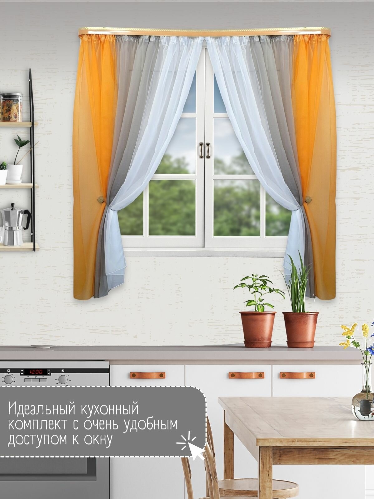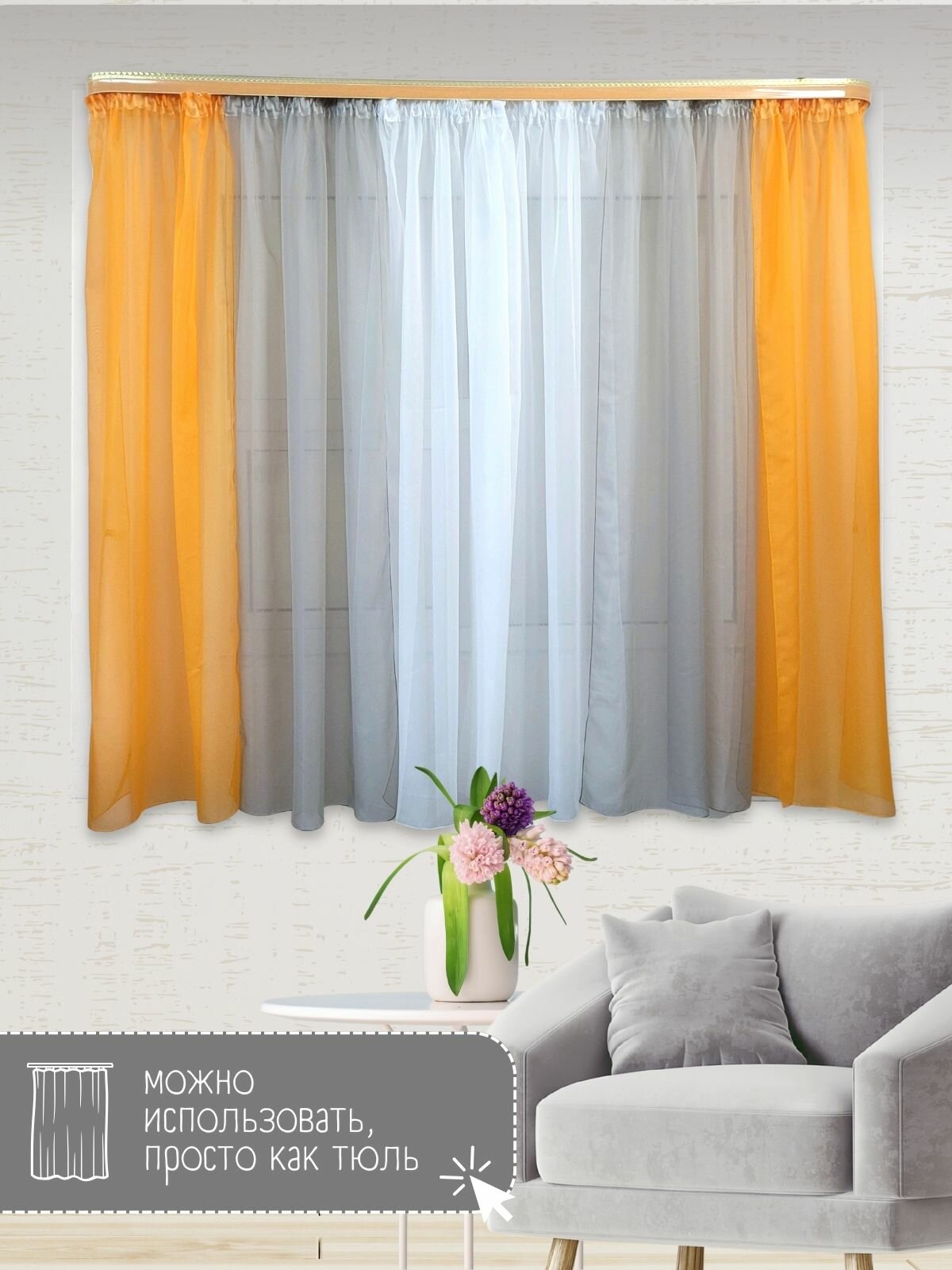 Отзывы на Шторы для кухни короткие тюль вуаль Домтекс35 "Радуга" 580*180см оранжевый/серый