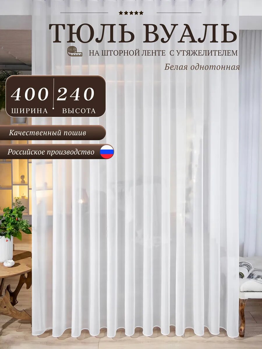 Тюль штора белый с утяжелителем под лен в спальню 400х240 информация: