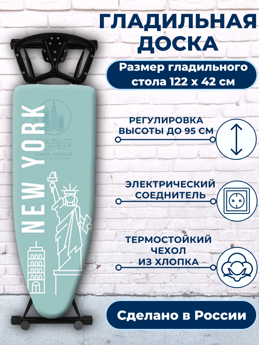 10 цен на Гладильная доска Ника 122 х 42 cм, с розеткой, подставкой под утюг, расцветка "Нью-Йорк"