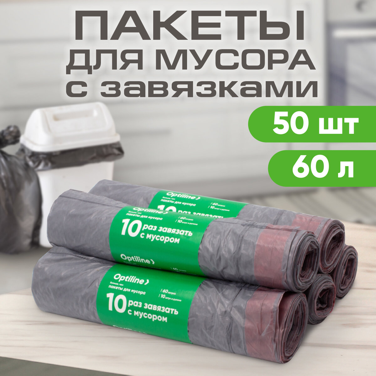 Отзывы на Мешки для мусора 60л с завязками 25 мкм, ПВД, 10шт/рул, 57х58 см, 5 рулонов в наборе (23-0056)