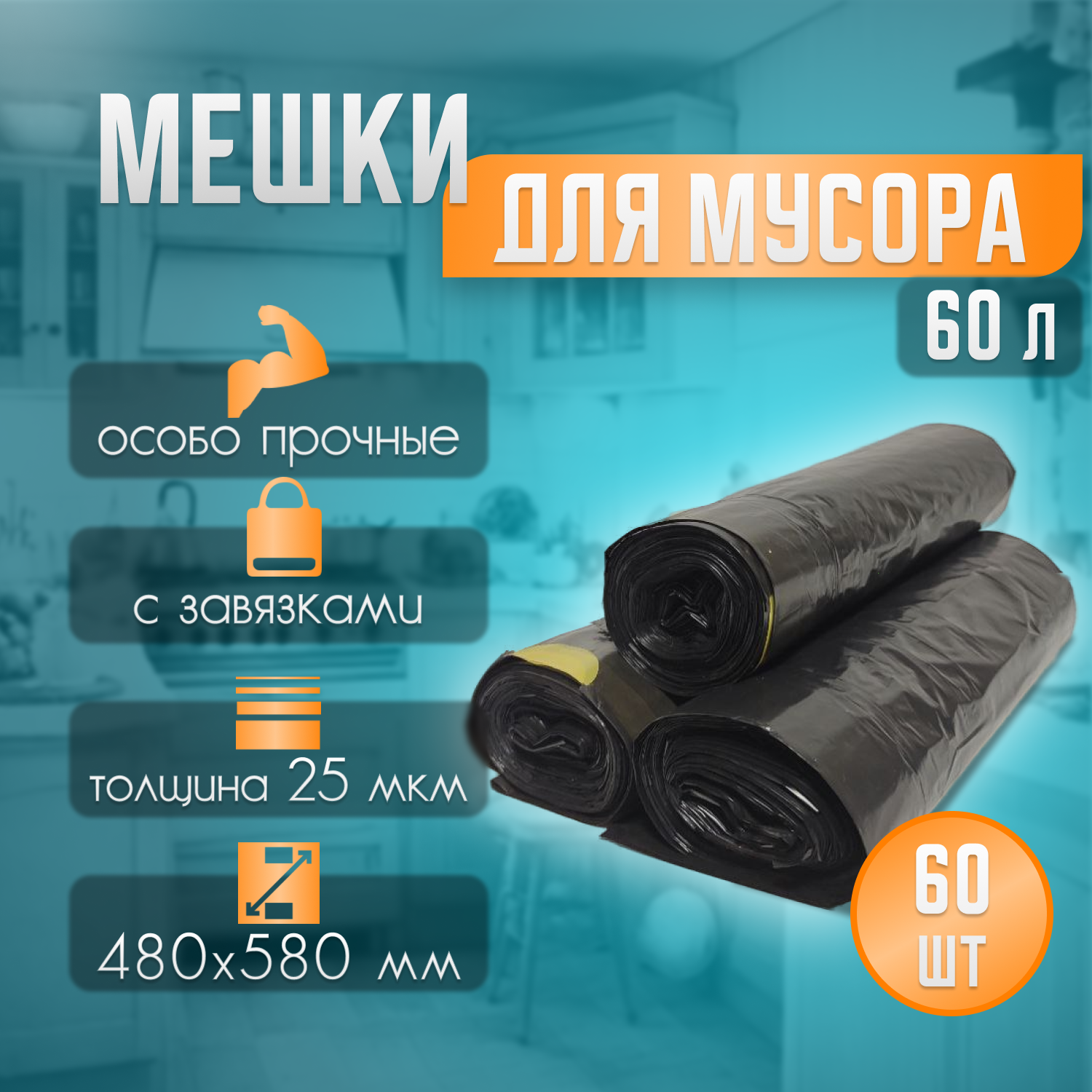 Пакет / мешок для мусора с завязками особо прочные (25 мкм), 60 литров, 60 штук в упаковке. информация: