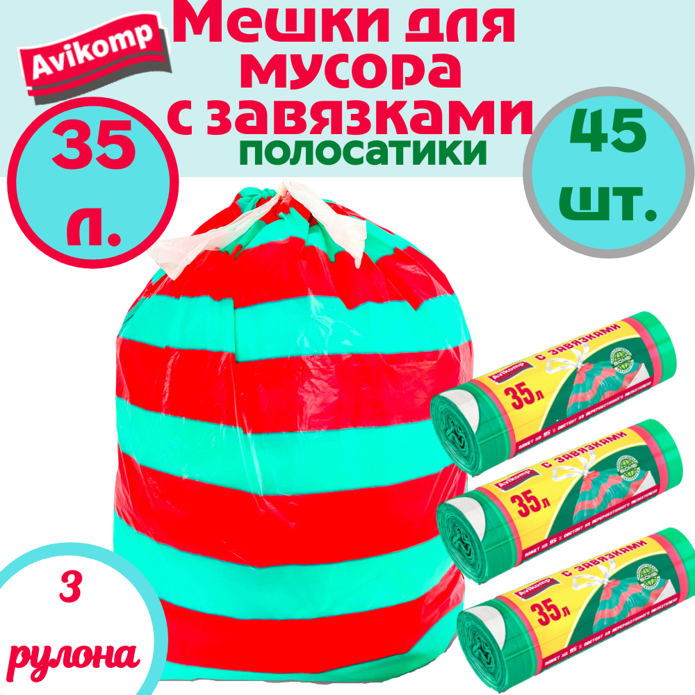 10 цен на Пакеты для мусора Prolang, AVIKOMP "Полосатики", с завязками, полиэтилен, 35 л в рулоне 15шт (3 упак.)
