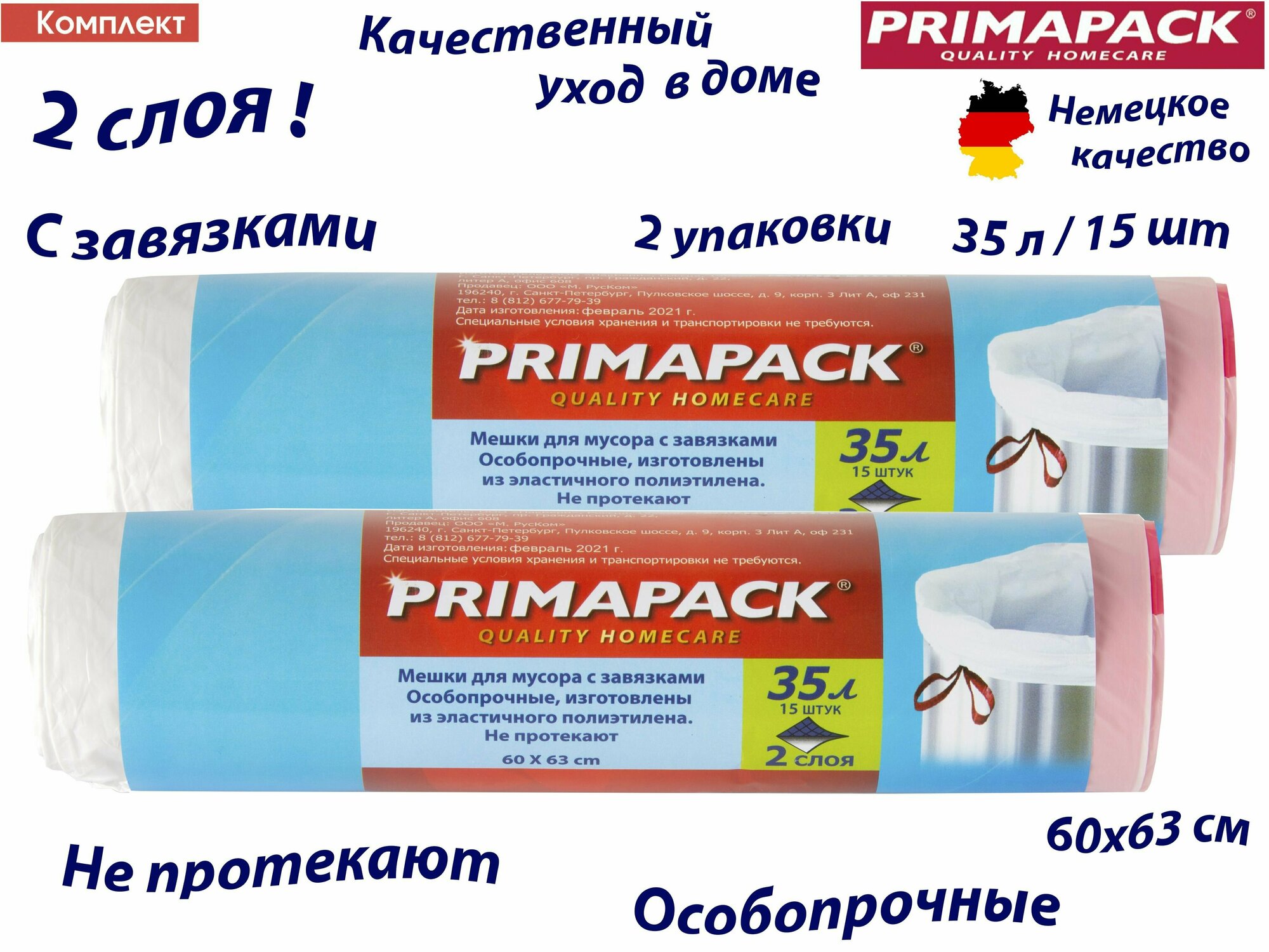 Отзывы на Комплект: 2 упаковки Мешки д/мусора Примапак 35л/15шт. с завязками, белые