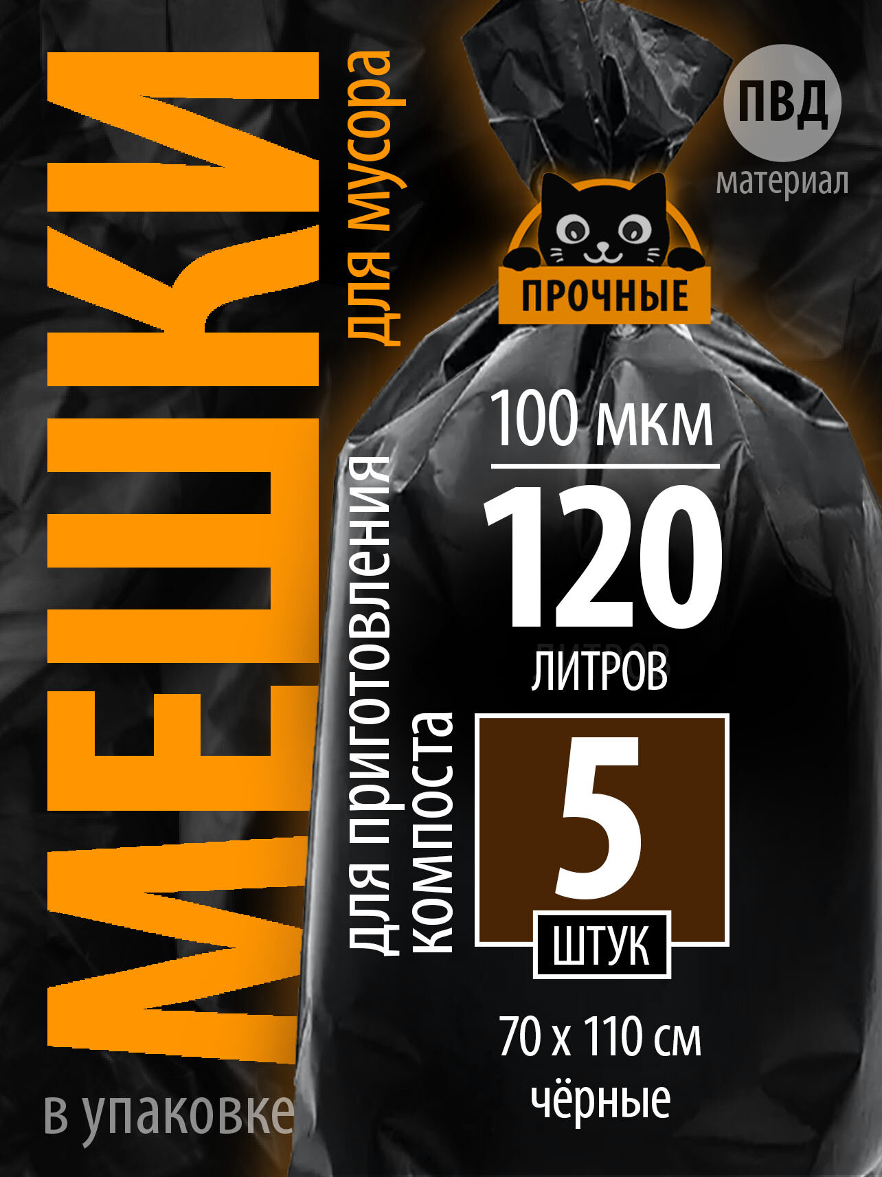 10 цен на Мешки для мусора прочные 120 литров, в упаковке 5 штук, ПВД, 100 мкм, размер 70х110 см, черные