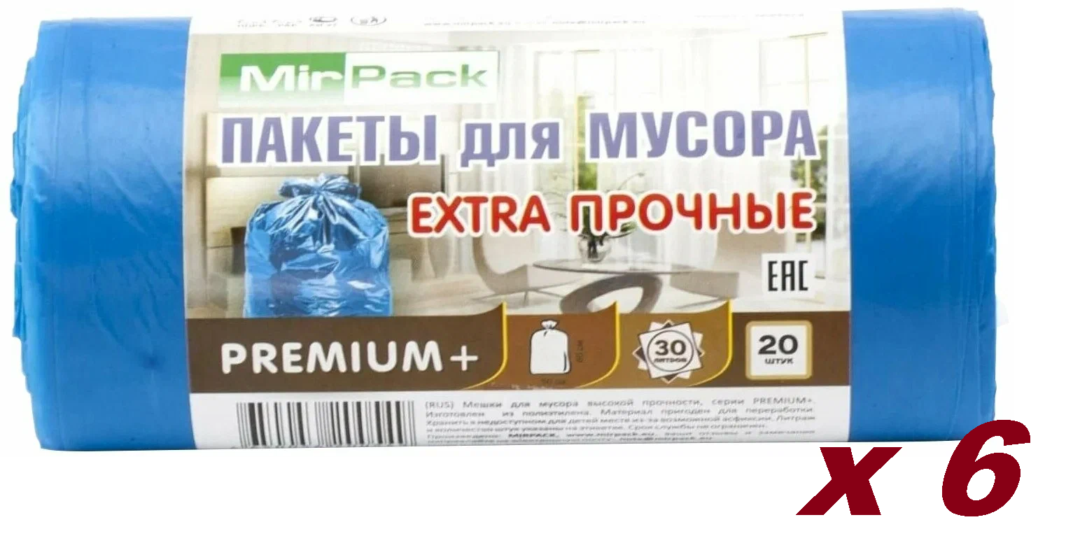 Мешки для мусора MIRPACK PREMIUM+ Extra прочные 30 л, 20 шт, 6 упак, синий информация: