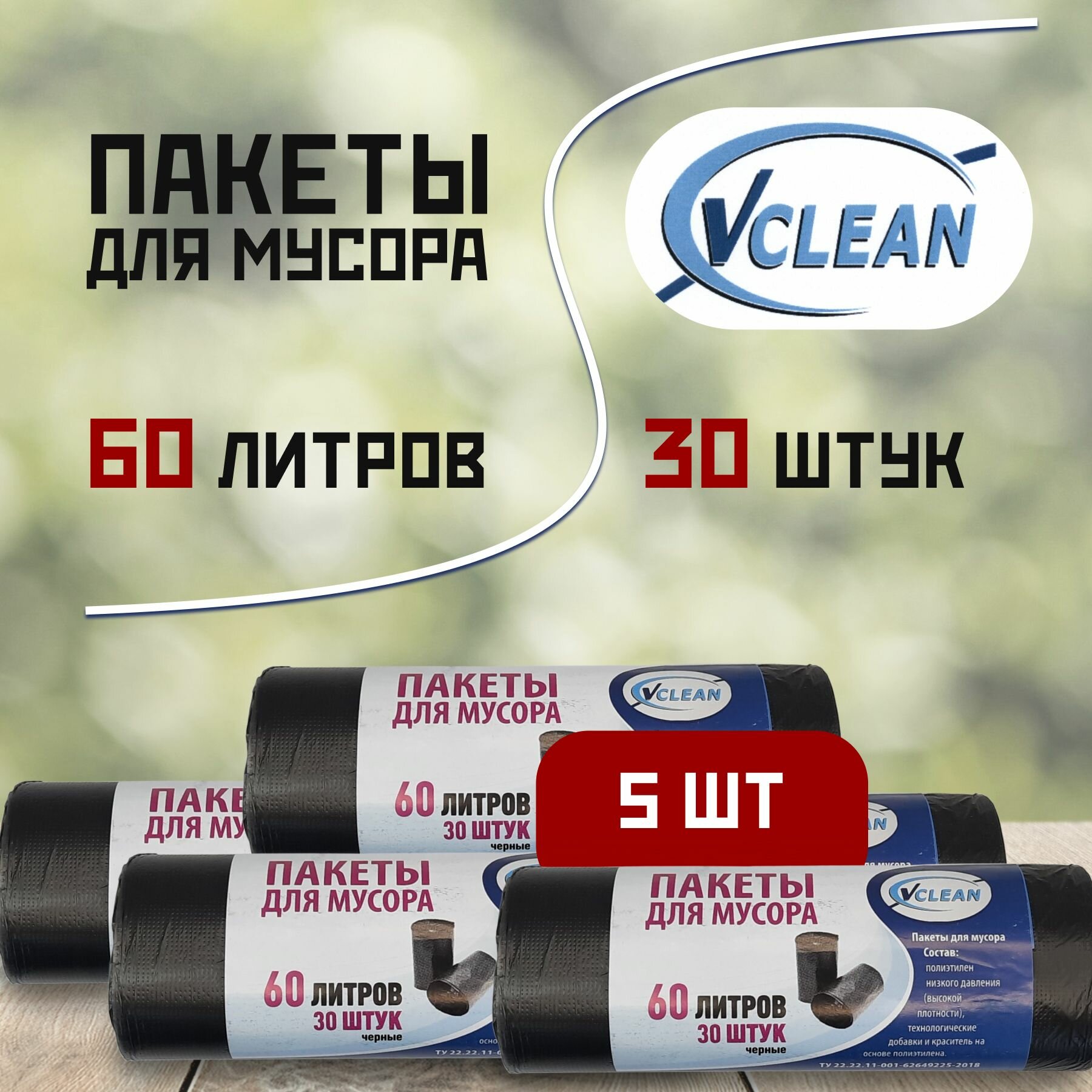 Мешки для мусора, мусорные пакеты Vclean 60л, 60x70 см, черные, 30 шт. 5 рулонов информация: