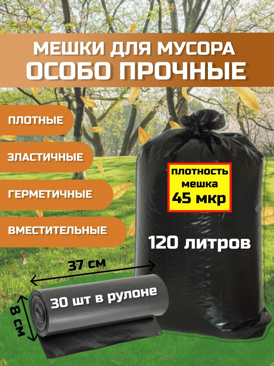 Мешки для мусора большие прочные 30 штук по 120 л черные в рулоне информация: