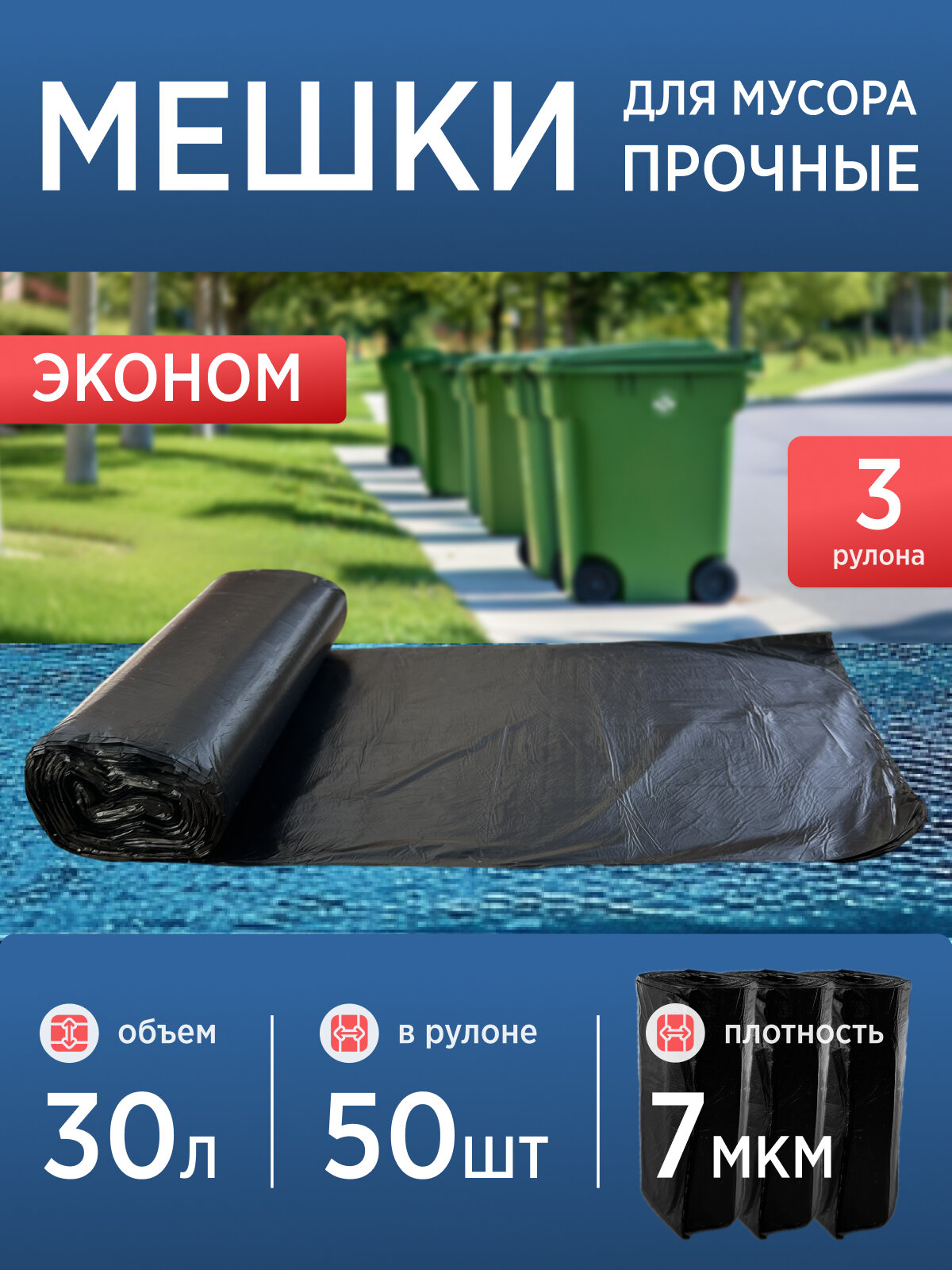10 цен на Мешки для мусора 30л. пакеты прочные 3 рулона по 50шт. 7мкм.