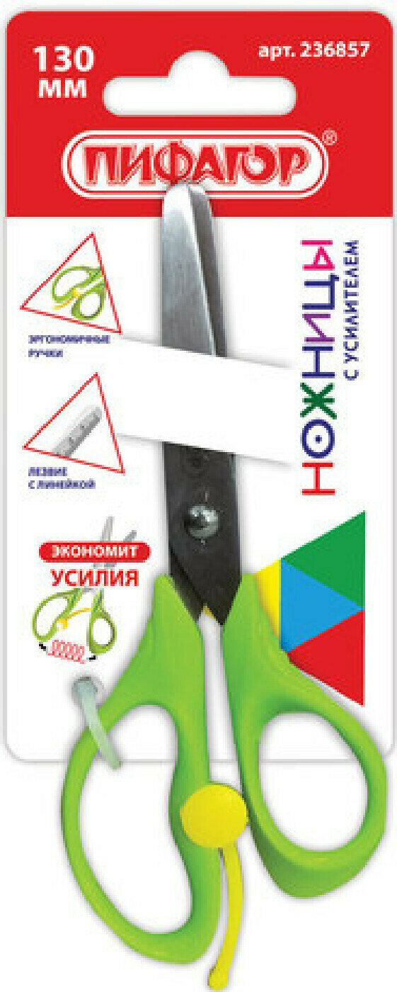 Ножницы пифагор, 130 мм, с усилителем, линейкой, зеленые, в картонной упаковке с европодвесом, 236857