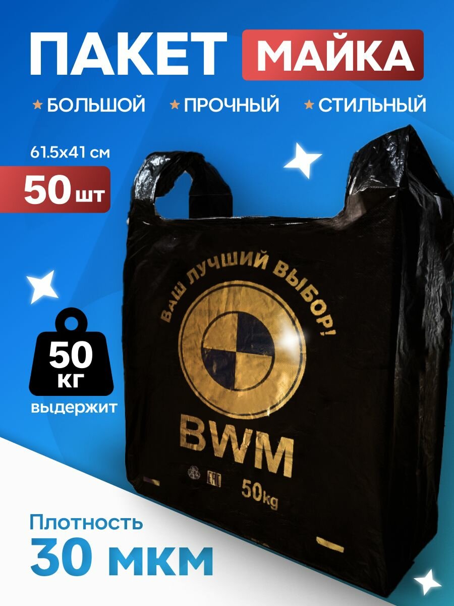 10 цен на Фасовочные пакеты, Пакет майка, BWM, с усиленными ручками, полиэтиленовые, черные, 30 мкм, 50 шт