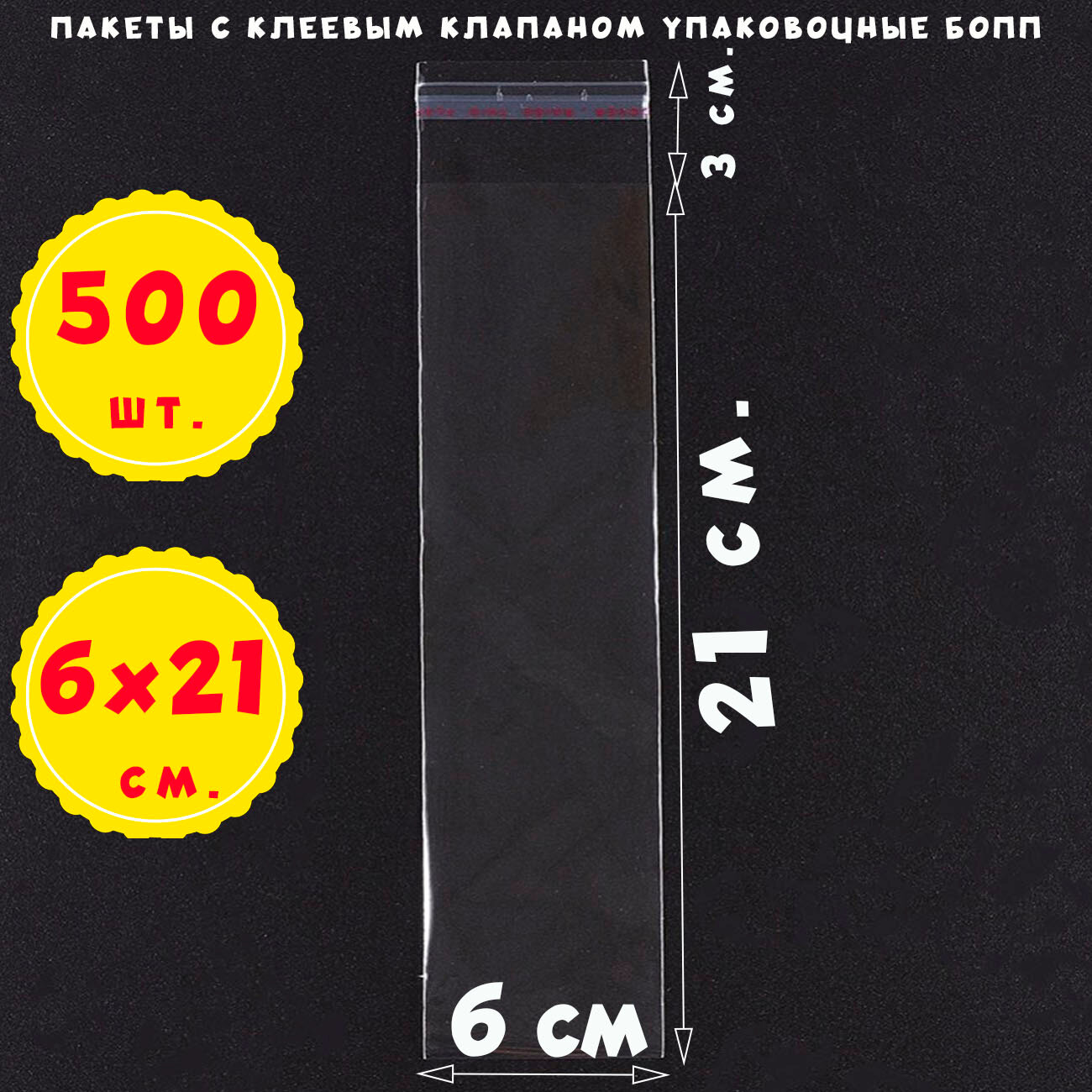 500 пакетов 6х21+3 см прозрачных с клеевым клапаном для упаковки из пленки бопп информация: