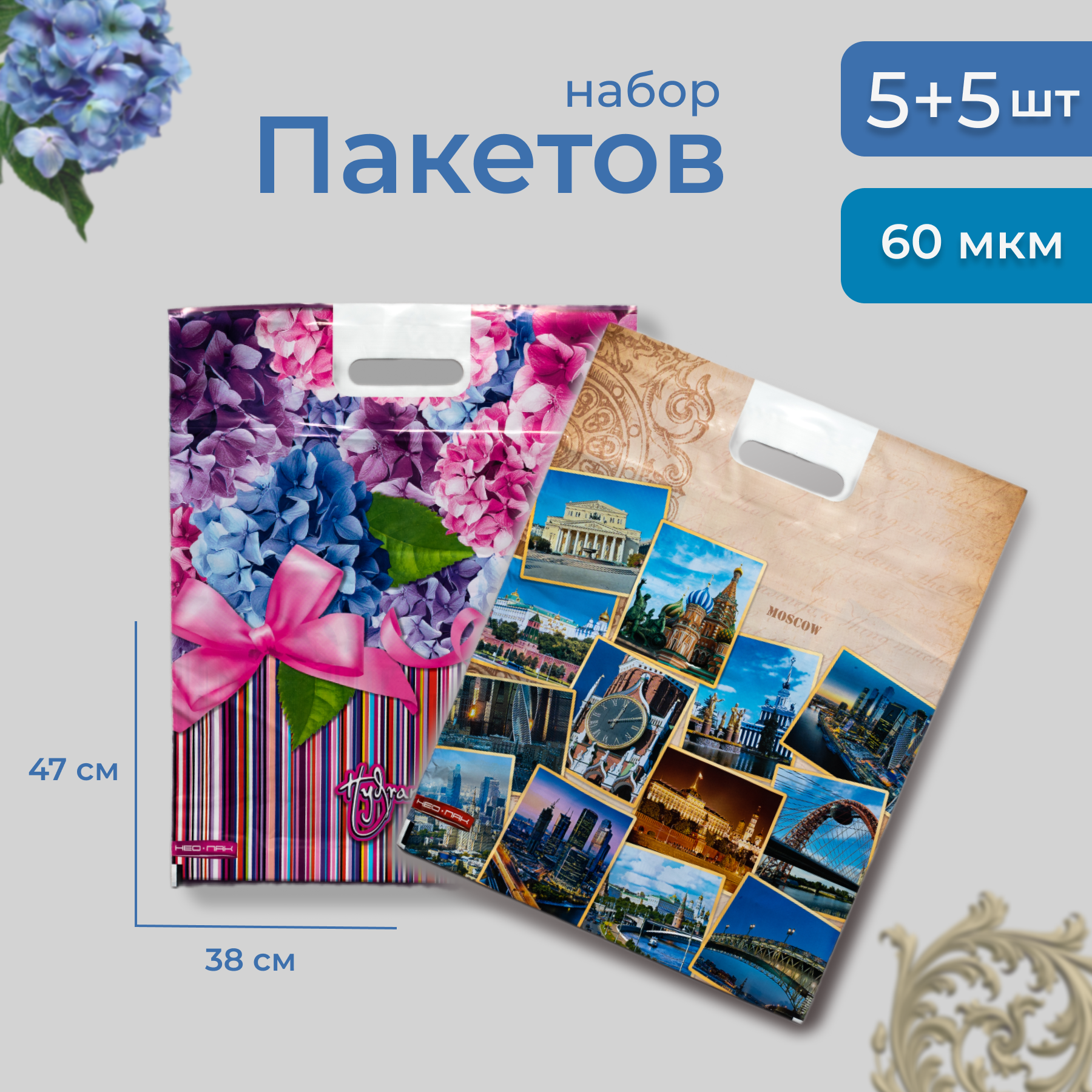 Пакет прорубная ручка Городская архитектура/Гортензия 38х47 60мкм 5шт+5шт информация: