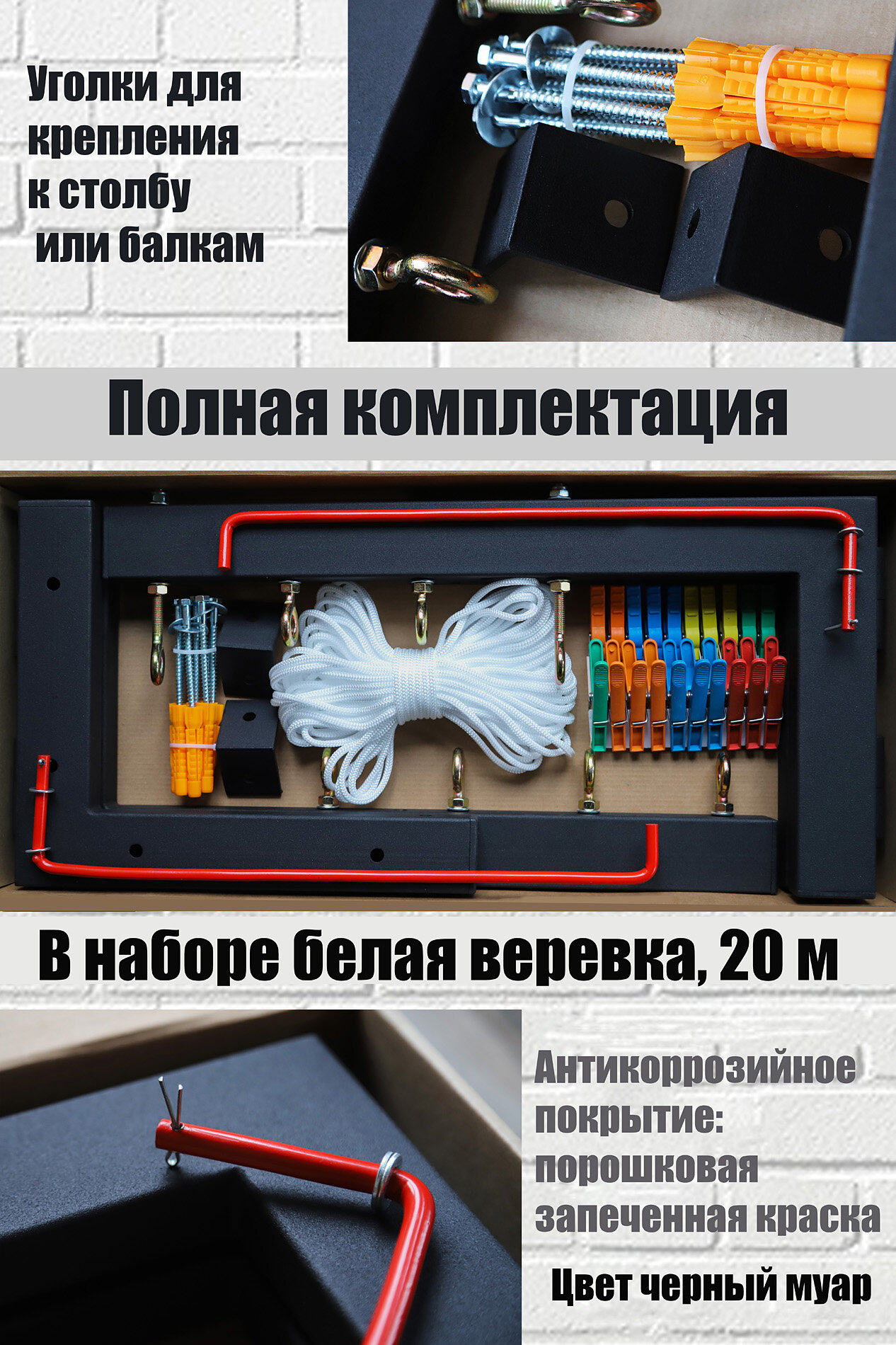 Сушилка для белья настенная, складная "Постирано", Черный цвет, Белая веревка информация: