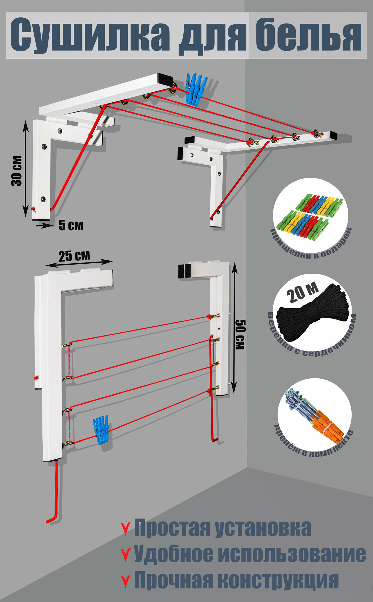 10 цен на Сушилка для белья настенная, складная "Постирано", Белый цвет, Черная веревка