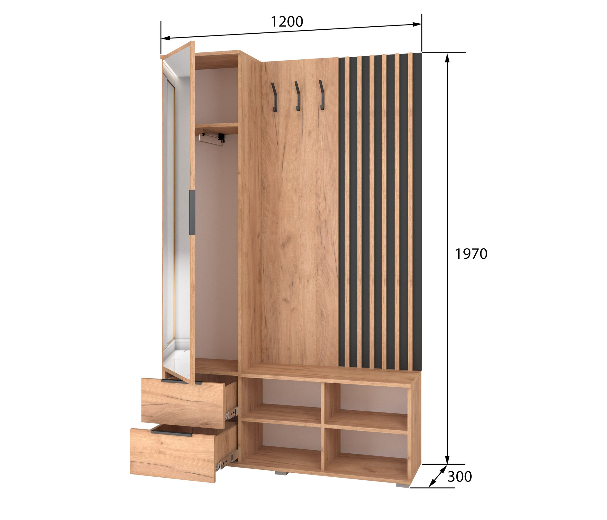Прихожая Сорренто, 1200x1970x300 мм, Дуб Крафт Золотой / Антрацит, 2 ящика, 3 полки, 1 дверь информация: