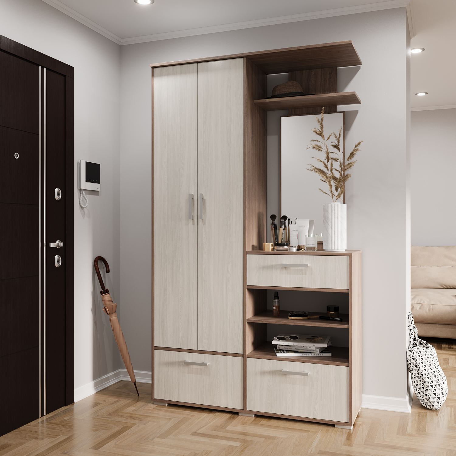 10 цен на Прихожая Агат 7 с зеркалом, цвет: ясень шимо темный/ясень шимо светлый Распашные двери (зеркало справа). 1200х400х2100 мм