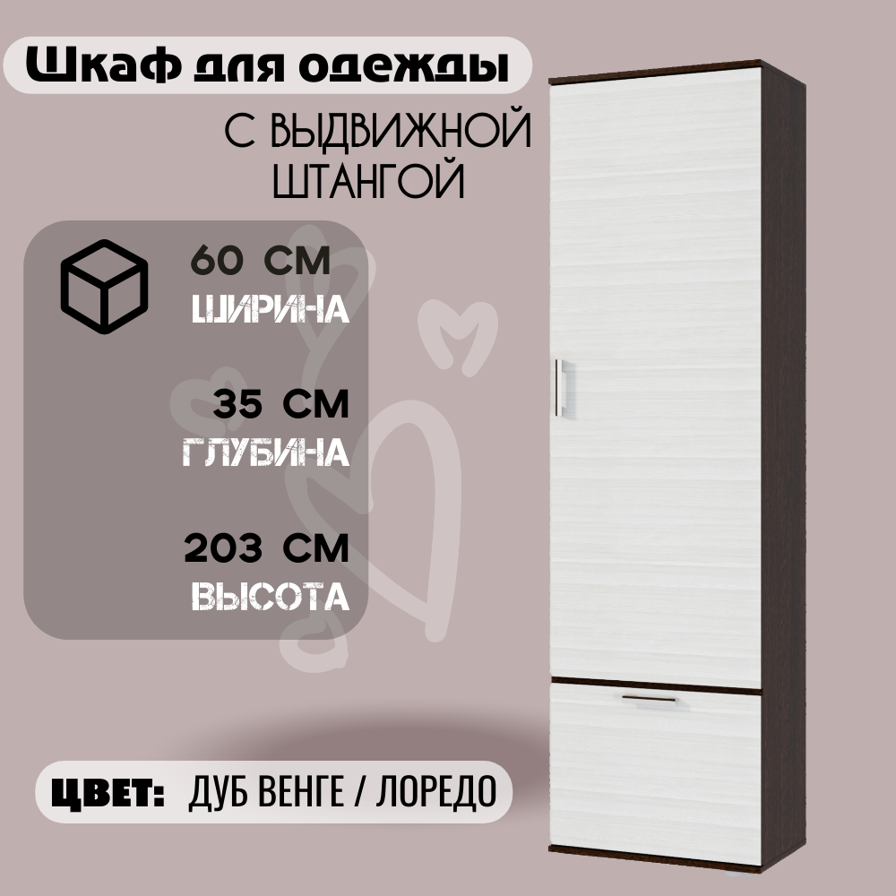 Шкаф для одежды платяной, с выдвижной штангой, ширина 60 см, цвет венге / сосна лоредо, ЛДСП информация: