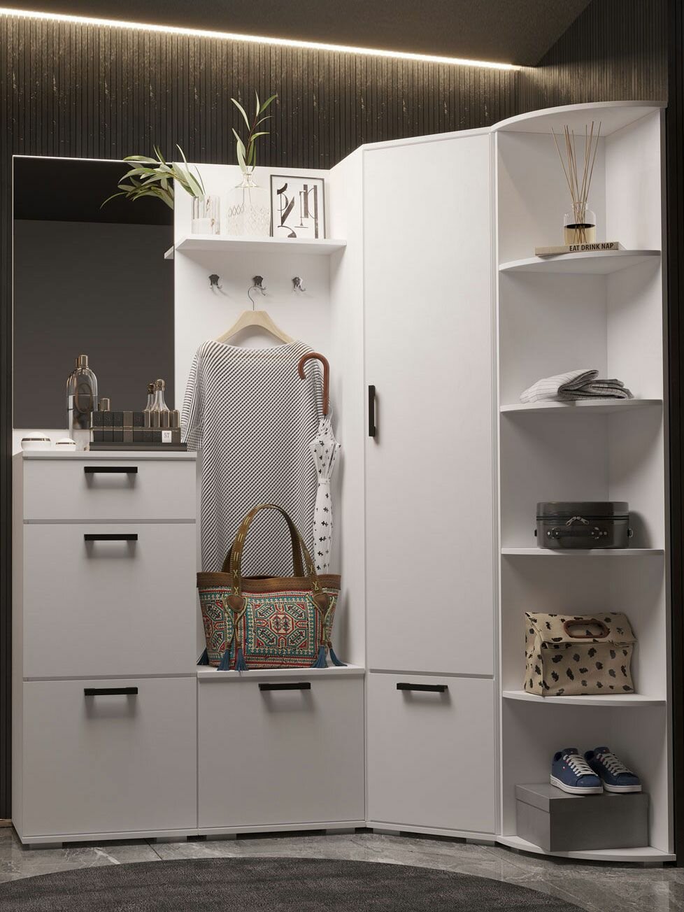 Прихожая комплект Алиса с вешалкой, со шкафом, с обувницей, с зеркалом, со стеллажом, 205.5х70.1х203.3 см, Белый гладкий информация: