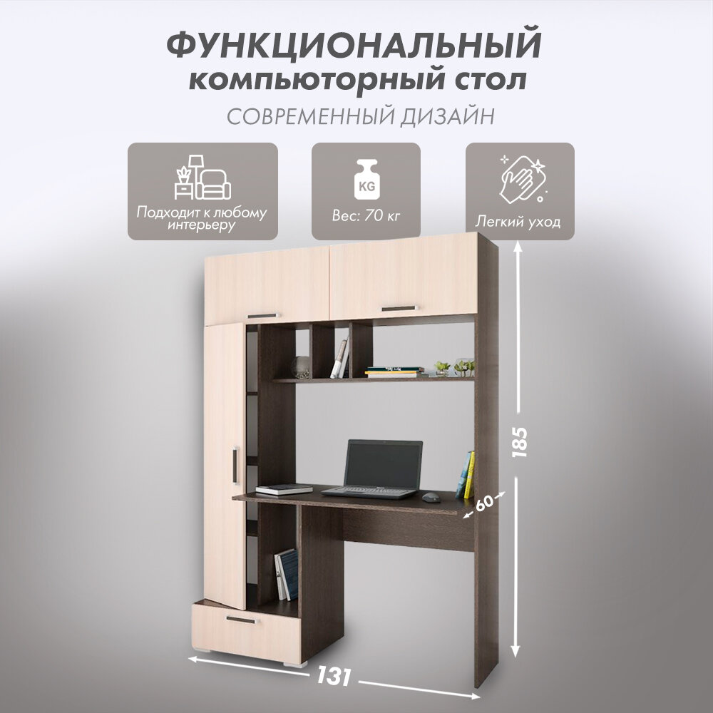 Отзывы на Стол компьютерный с надстройкой, с пеналом, с полками, ЛДСП, Венге/дуб молочный 132*185*60 см Квартет-11