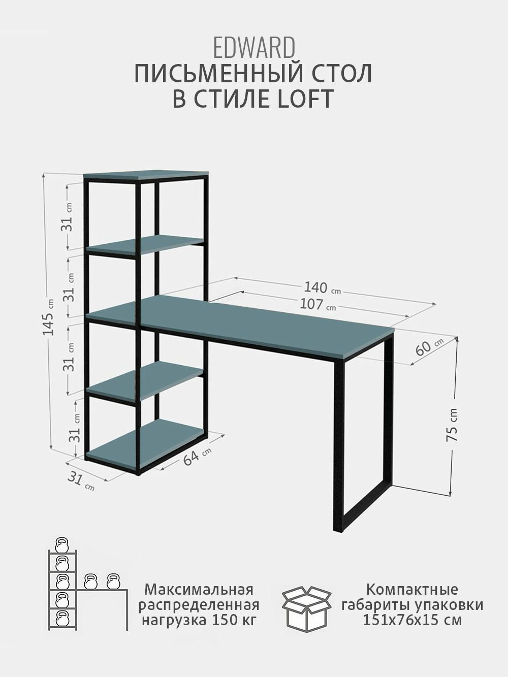 Отзывы на Стол письменный с полками EDWARD, голубой, компьютерный для школьника, офиса, рабочий гростат 140х60х75 см.