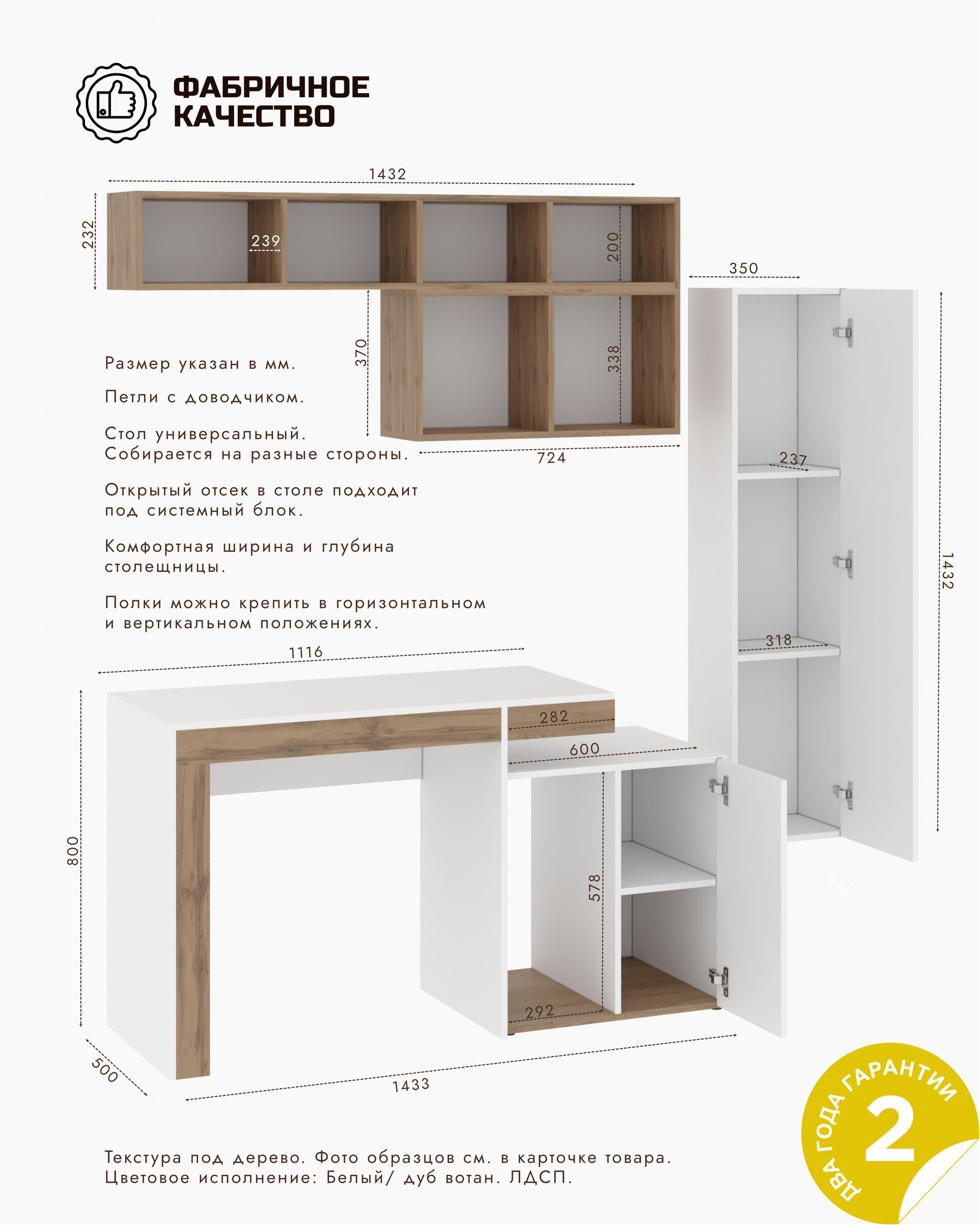 Компьютерный стол OXFORD К2 Белый/Дуб вотан информация: