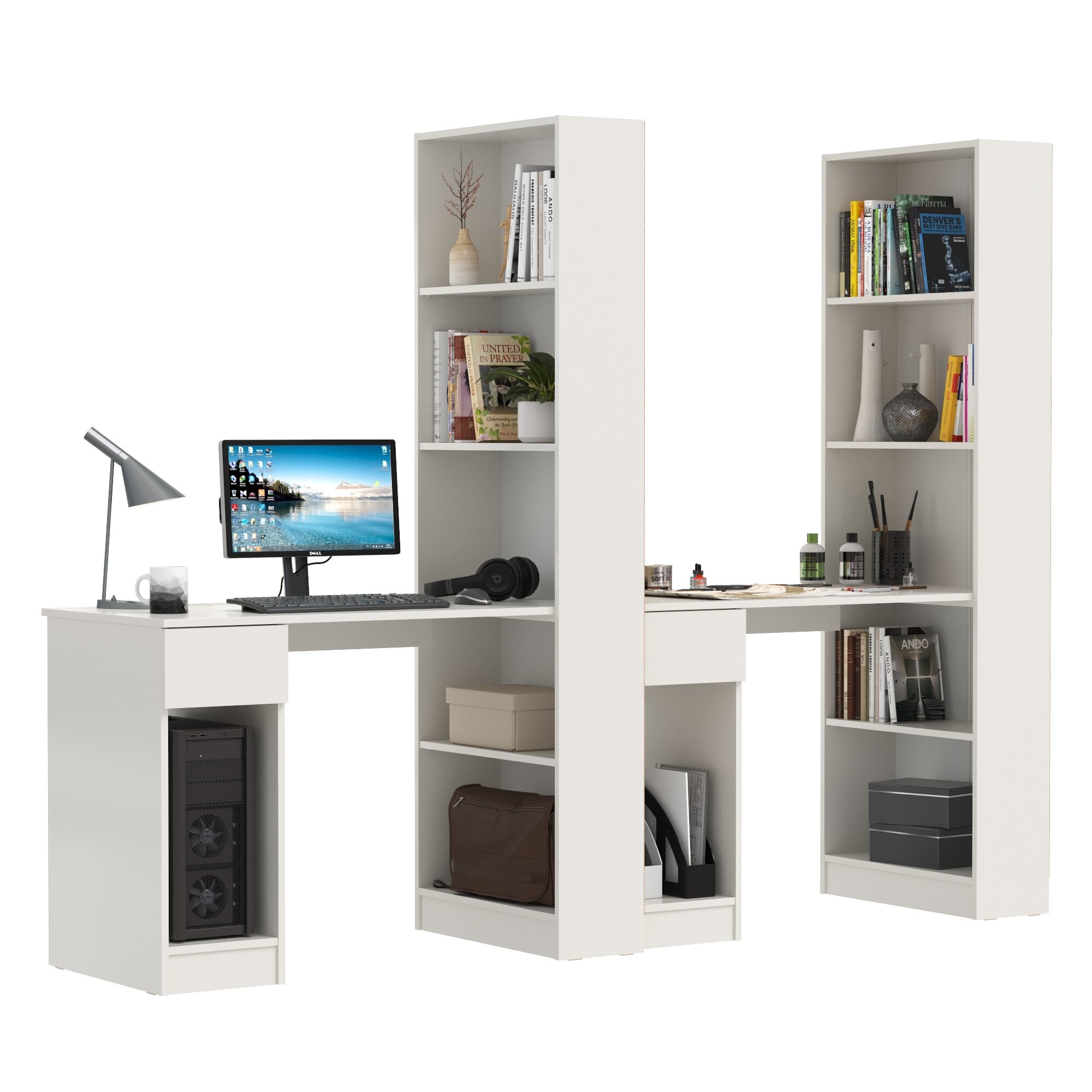 10 цен на Два компьютерных стола со стеллажом Mobi Лайт 10.01 белый гладкий, (ШхГхВ) 230,6х58х179 см