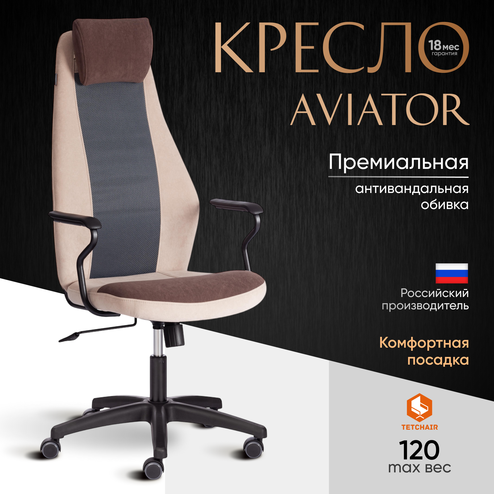Компьютерное кресло TetChair AVIATOR, флок, ткань, коричневый/бежевый/серый информация: