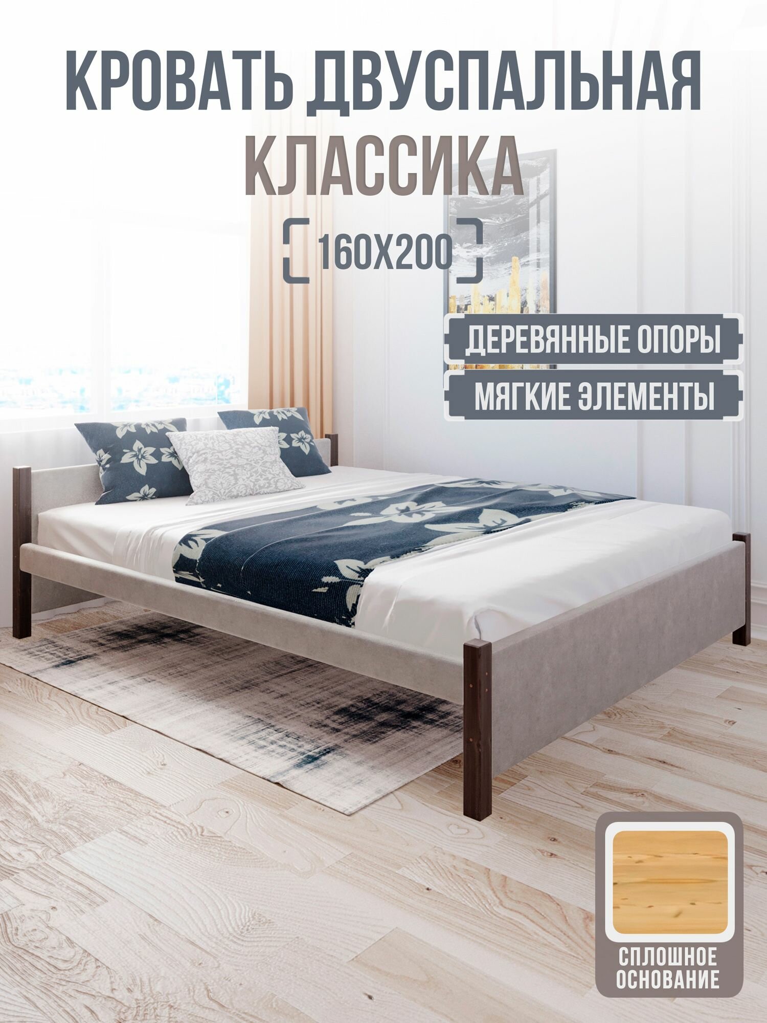 Кровать двуспальная Классика из массива сосны, 160х200 см, со сплошным основанием и мягкой светло-серой обивкой, ножки цвета венге информация: