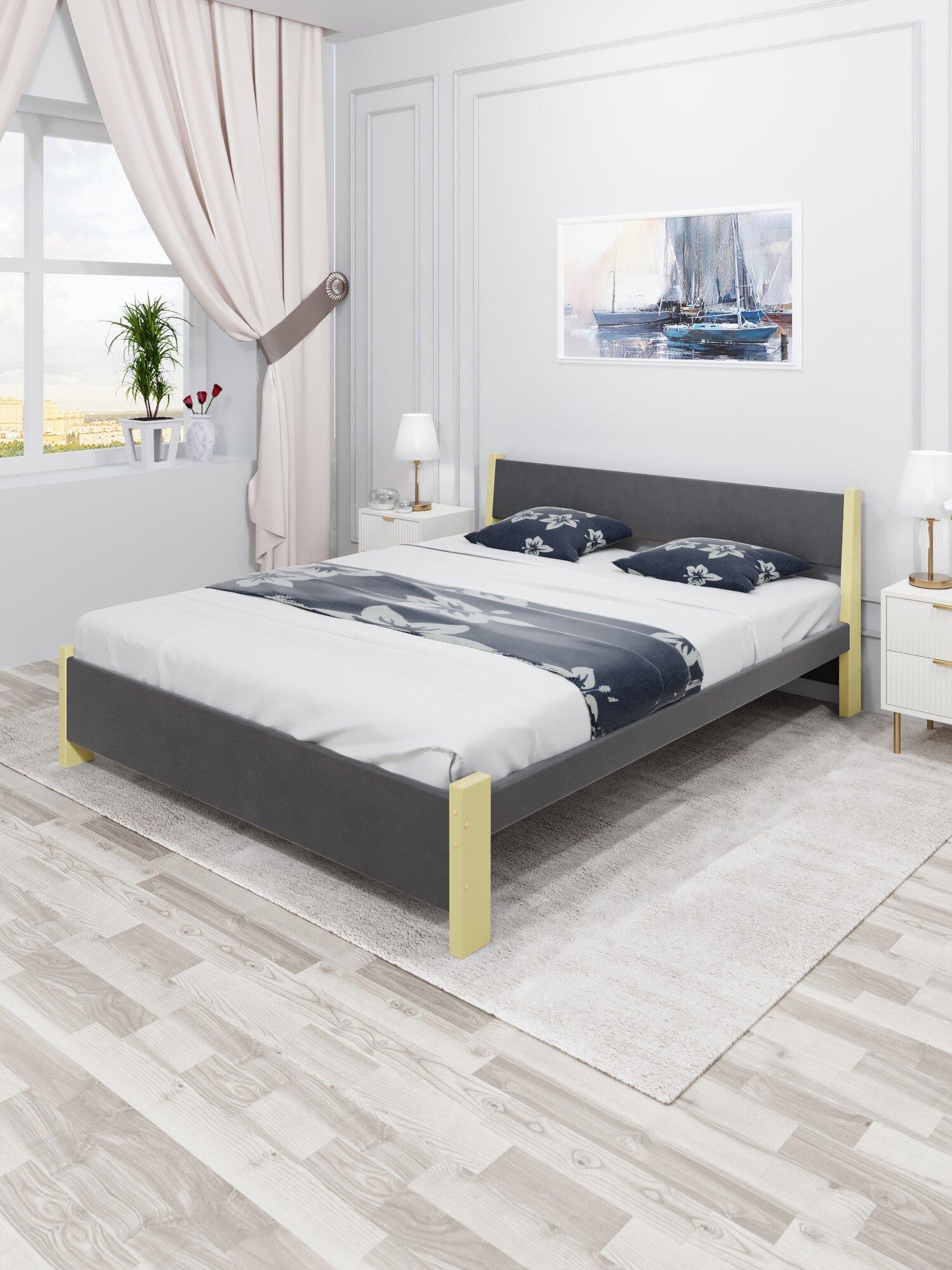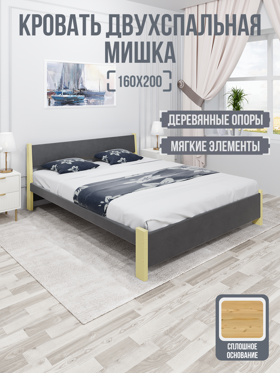 Кровать Solarius "Мишка", двуспальная, массив сосны, обивка текстиль, бежево-темно-серая информация: