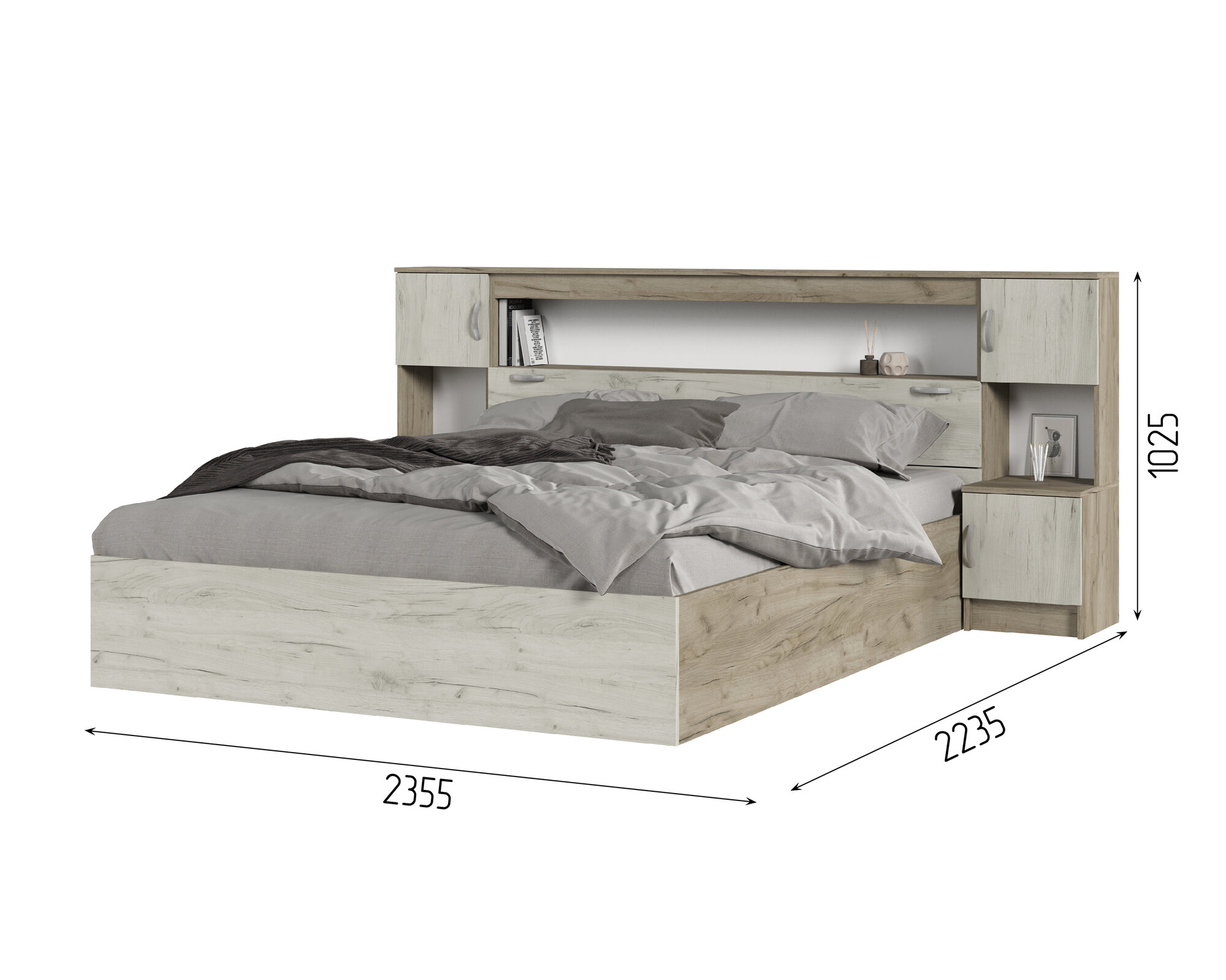 Кровать с прикроватным блоком Стендмебель Бася КР 552 (235х102х223см) дуб крафт серый-дуб крафт белый