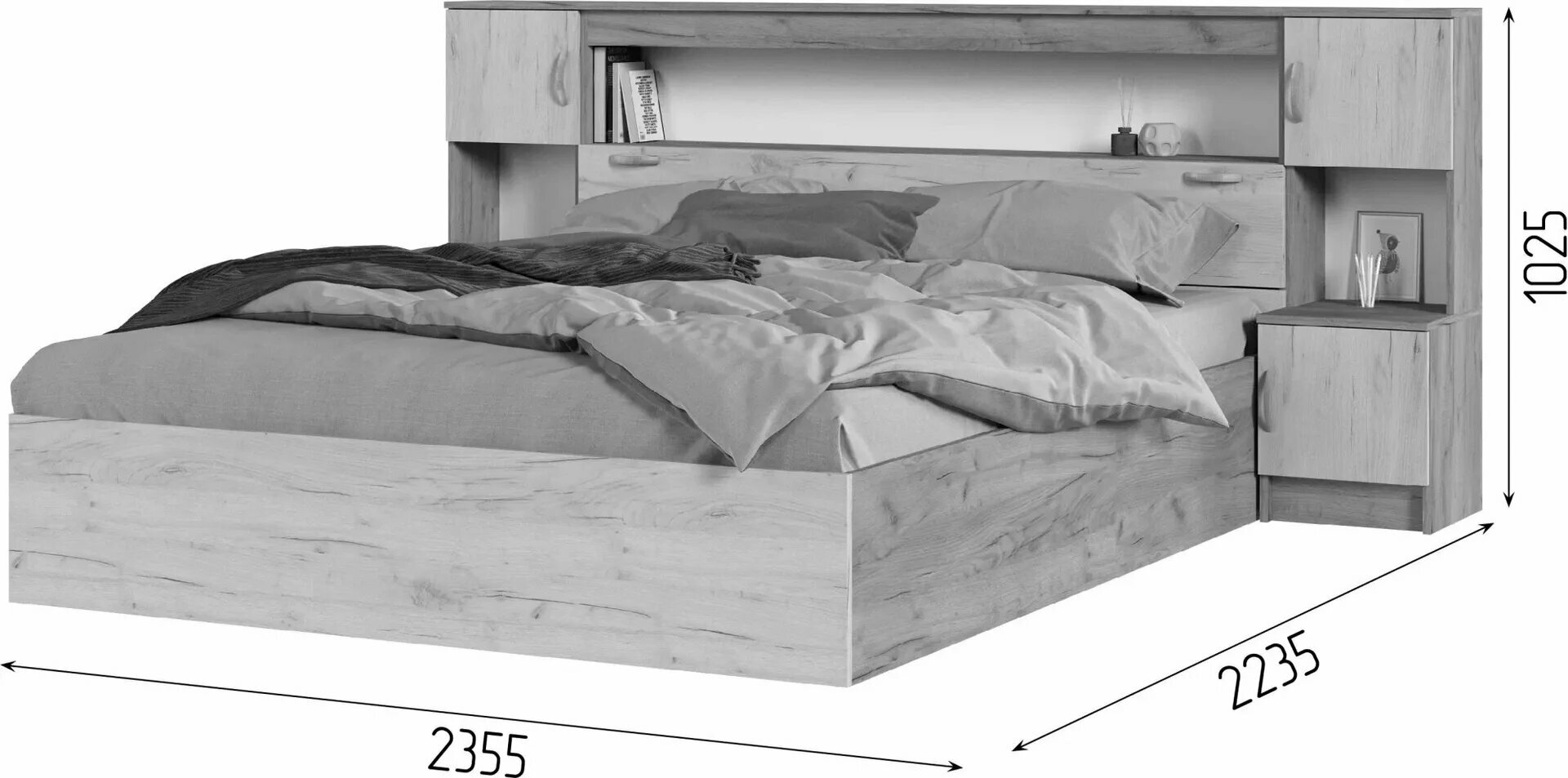 Кровать двуспальная КР 552 «Бася» ЛДСП с прикроватным блоком 160х200, дуб крафт серый/дуб крафт белый (2352х2232х1016) информация: