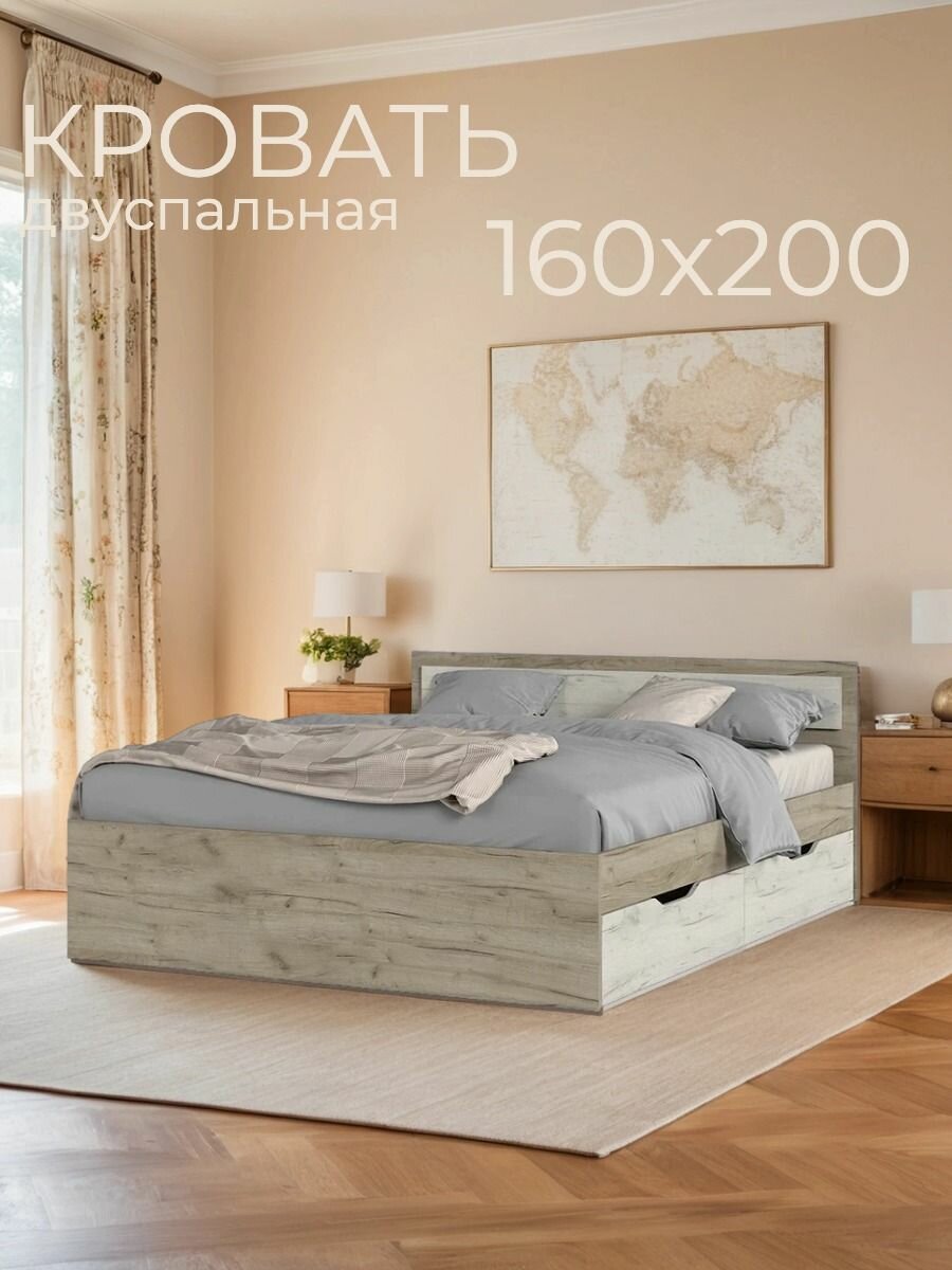 Кровать 160х200 двуспальная с ящиками, Гармония КР 604, Дуб Крафт Белый / Дуб Крафт Серый