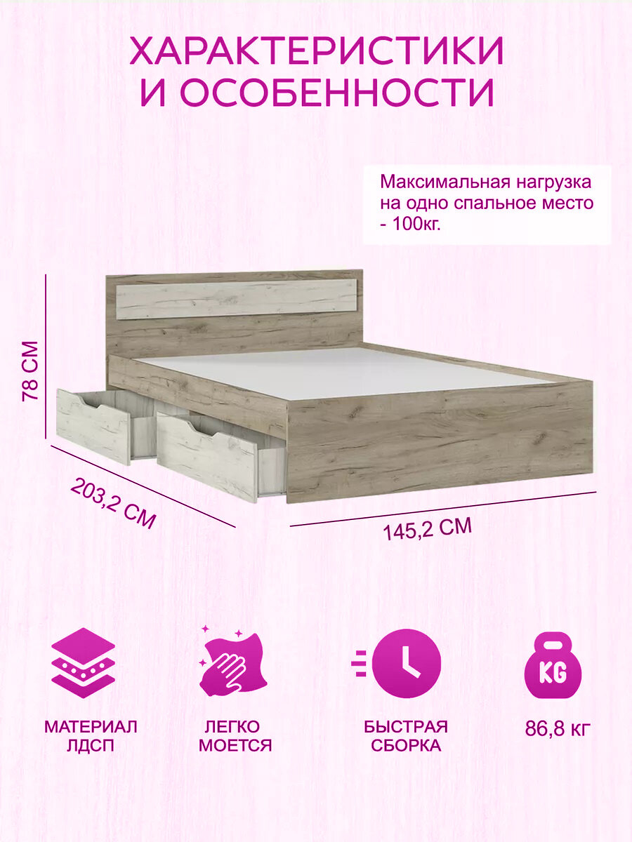 Кровать с ящиками, габаритный размер: 1452x780x2032 мм, спальное место: 1400x2000 мм. Корпус: ЛДСП дуб крафт серый, фасад: ЛДСП дуб крафт белый. информация: