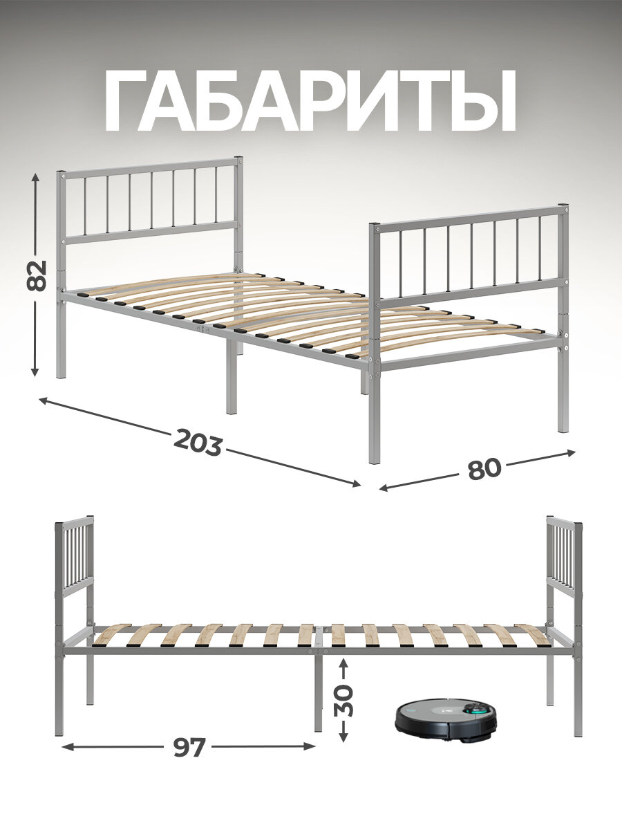 Кровать металлическая Металика В3+В3 80х200 серая с держателями для матраса и доп. опорами информация:
